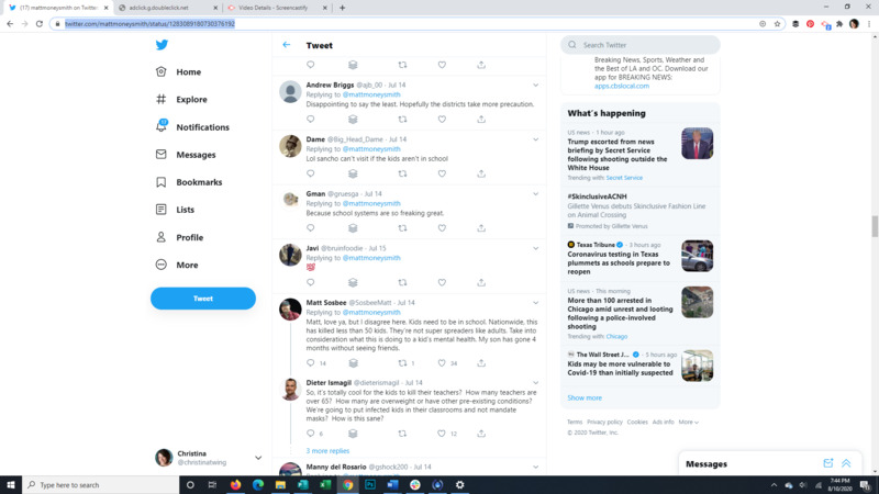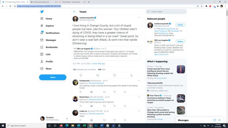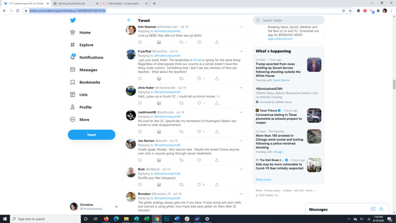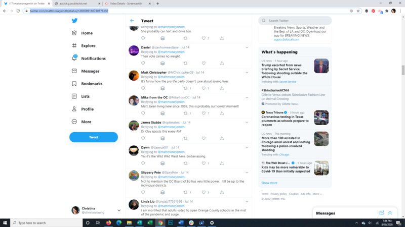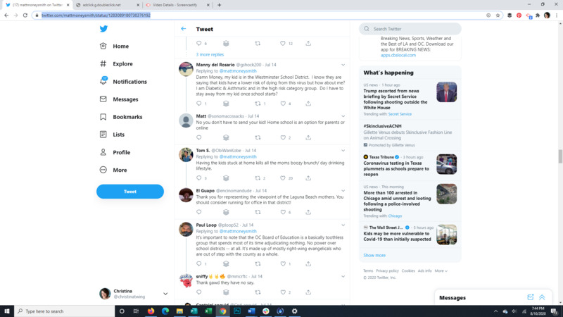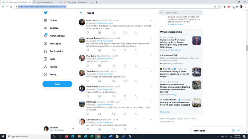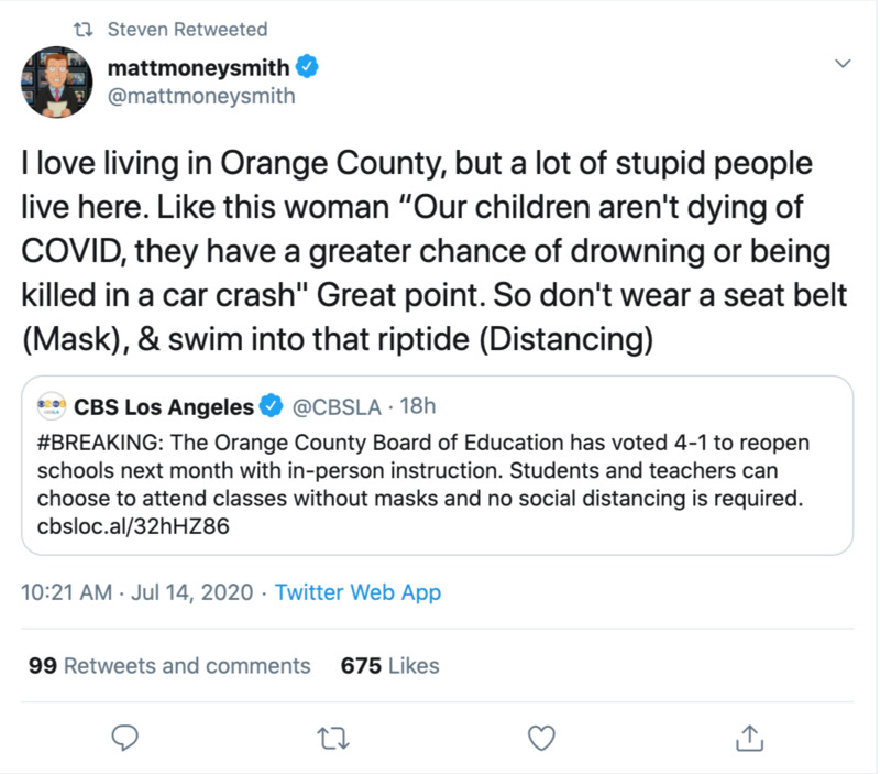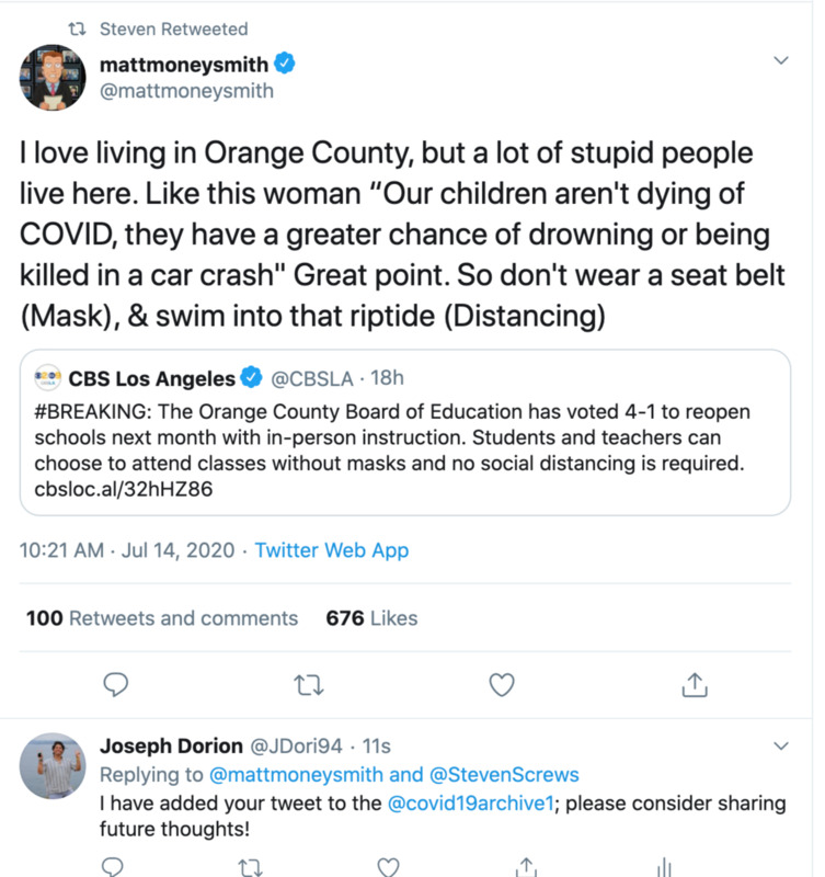 This item was added TAGS v6.1.9.1. I originally searched under the hashtag #orangecounty. Within that search, I have chosen to add the following tweet because it highlights the public reaction to the ongoing debate on how to successfully get students back to school.