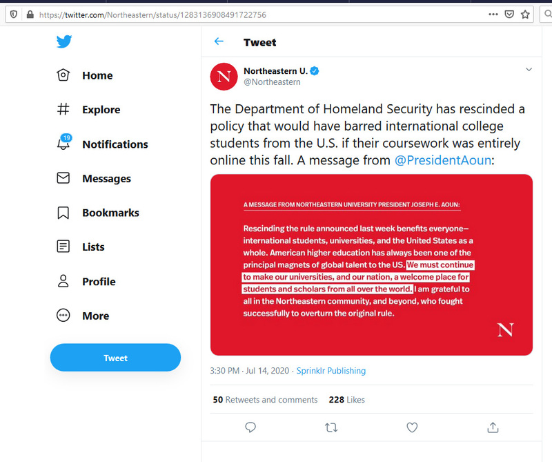 ICE last week instituted a rule that said if international students took all online classes, they couldn't stay in America on a visa. Schools in Boston, including Harvard and MIT filed a lawsuit against the Department of Homeland Security. Northeastern joined the lawsuit, and on July 14, ICE rescinded the rule, allowing students to stay in the US and continue their education, even if all of their classes are online because of the pandemic. It's not safe to gather in large groups yet, especially indoors, and schools are starting to release fall plans mainly online.