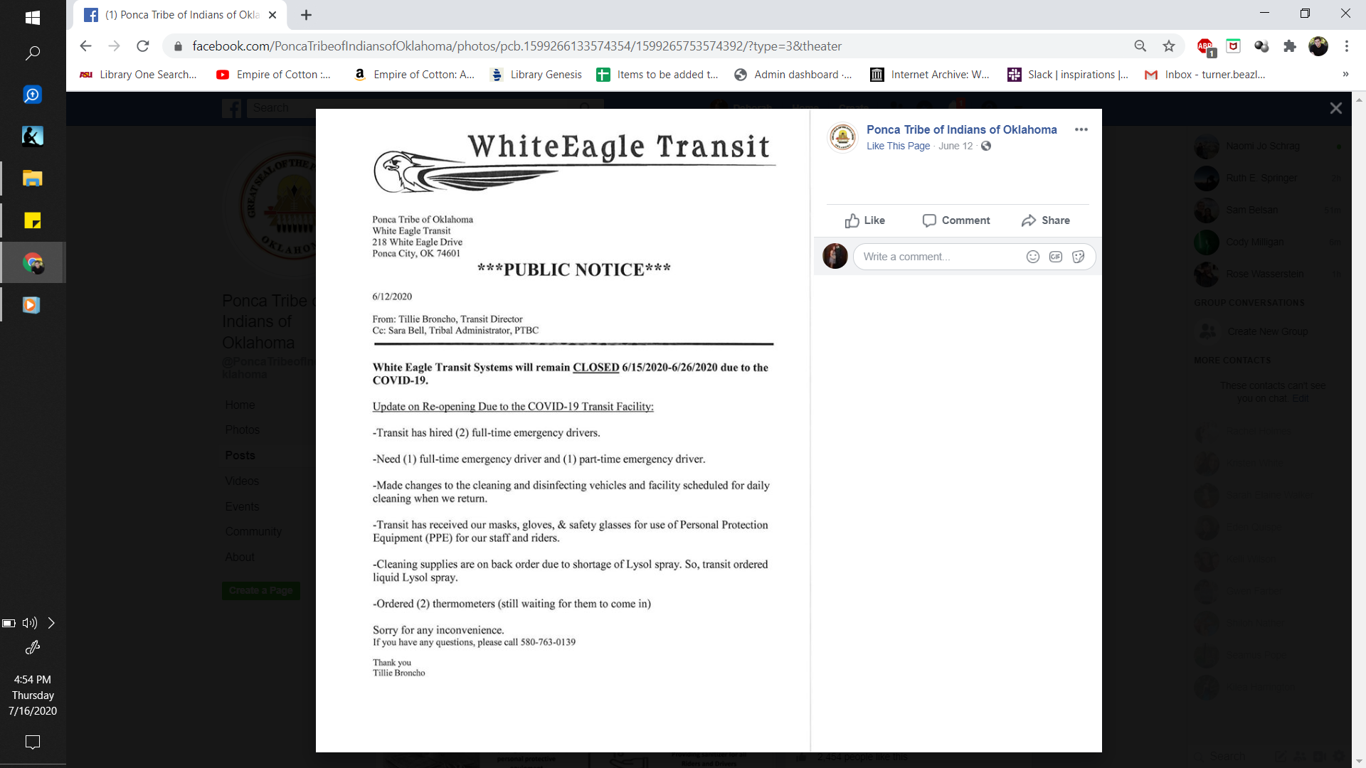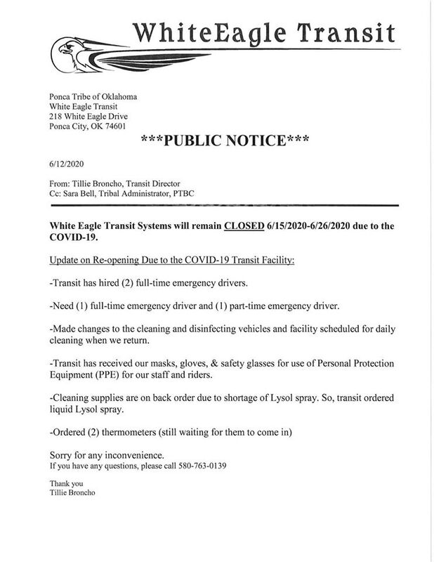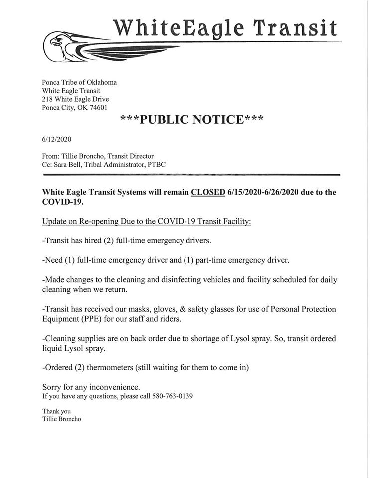 "White Eagle Transit Systems will remain CLOSED 6/15/2020-6/26/2020 due to the COVID-19."
