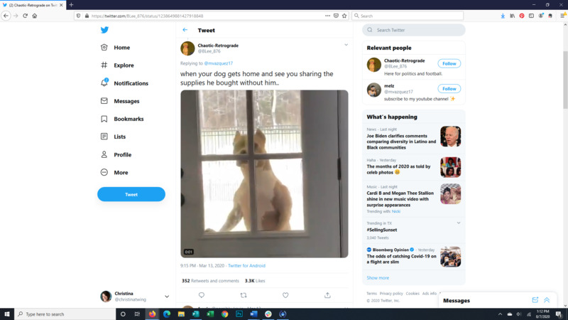 Then there was a follow up video of a large dog staring into the glass door captioned: when your dog gets home and see you sharing the supplies he bought without him.