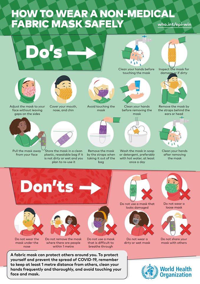 A infographic produced by the World Health Organization, it reads "HOW TO WEAR A NON-MEDICAL FABRIC MASK SAFELY / Do's --> / Clean your hand before touching the mask / Inspect the mask for damage or if dirty / Adjust the mask to your face without leaving gaps on the sides / Cover your mouth, nose, and chin / Avoid touch the mask / Clean your hands before removing the mask / Remove the mask by the straps behind the ears of head / Pull the mask away from your face / Store the mask in a clean plastic, resealable bag if it is not dirty or wet and you plan to re-sure it / Remove the mask by the straps when taking it out of the bag / Wash the mask in soap or detergent, preferably with hot water, at least once a day / Clean your hands after removing the mask / Don'ts --> / Do not use a mask that looks damaged / Do not wear a loose mask / Do not wear the mask under the nose / Do not remove the mask where there are people within 1 metre / Do not use a mask that is difficult to breathe through / Do not wear a dirty or wet mask / Do not share your mask with others / A fabric mask can protect others around you. To protect yourself and prevent the spread of COVID-19, remember to keep at least 1 metre distance from others, clean your hands frequently and thoroughly, and avoid touching your face and mask."