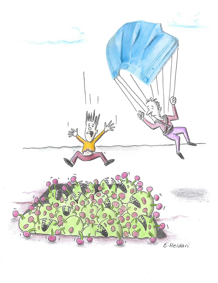 A cartoon depicting two people falling over a pit filled with virus cells which have mouths and teeth. One is falling rapidly which the other is floating away from the pit on a parachute made from a disposable surgical mask.