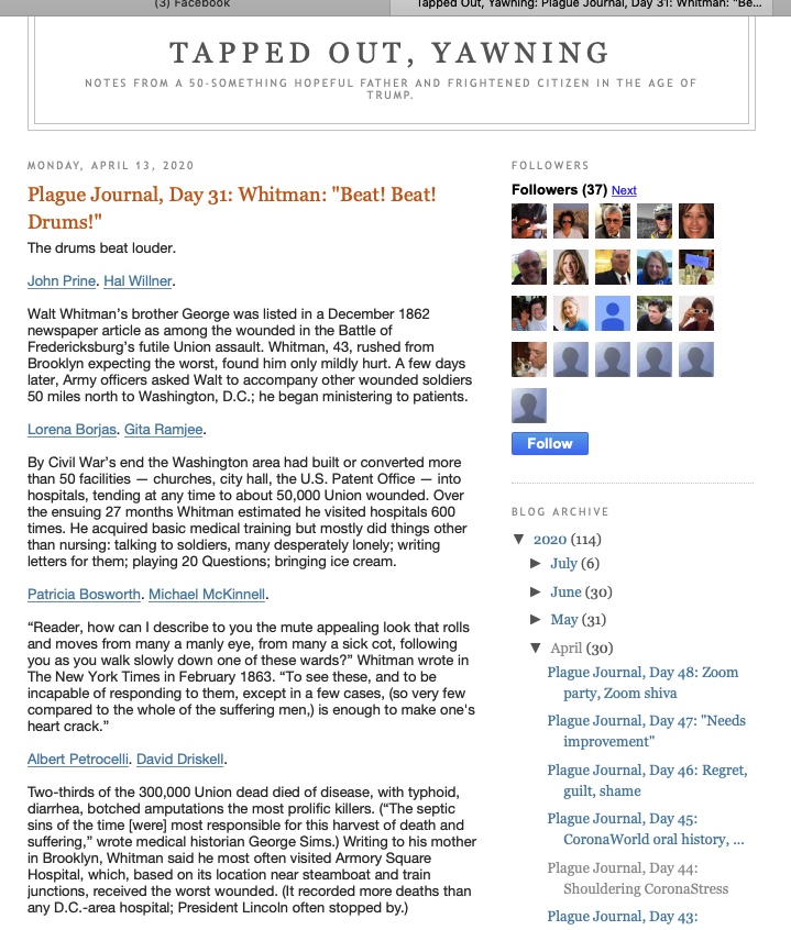 I'm keeping a Covid-19 journal. Here's the latest entry, filled with obituaries, Walt Whitman's tales of Civil War hospitals, and a poem.