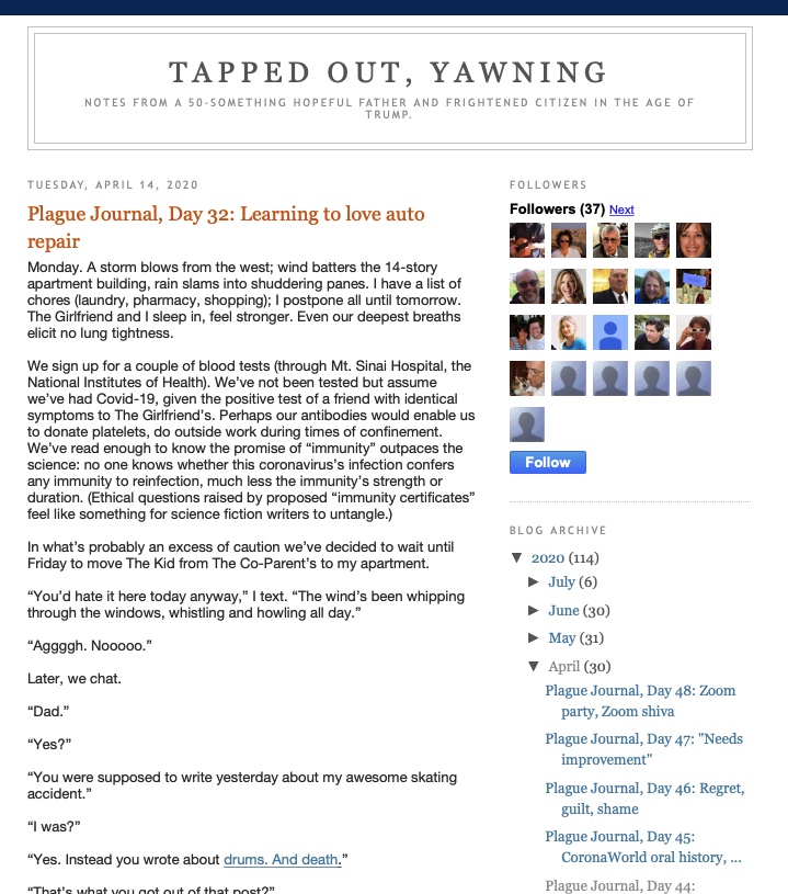 I'm keeping a Covid-19 journal. The latest entry discusses The Kid, a roller skating accident, Pringles, and my fear of auto-repair shops.
