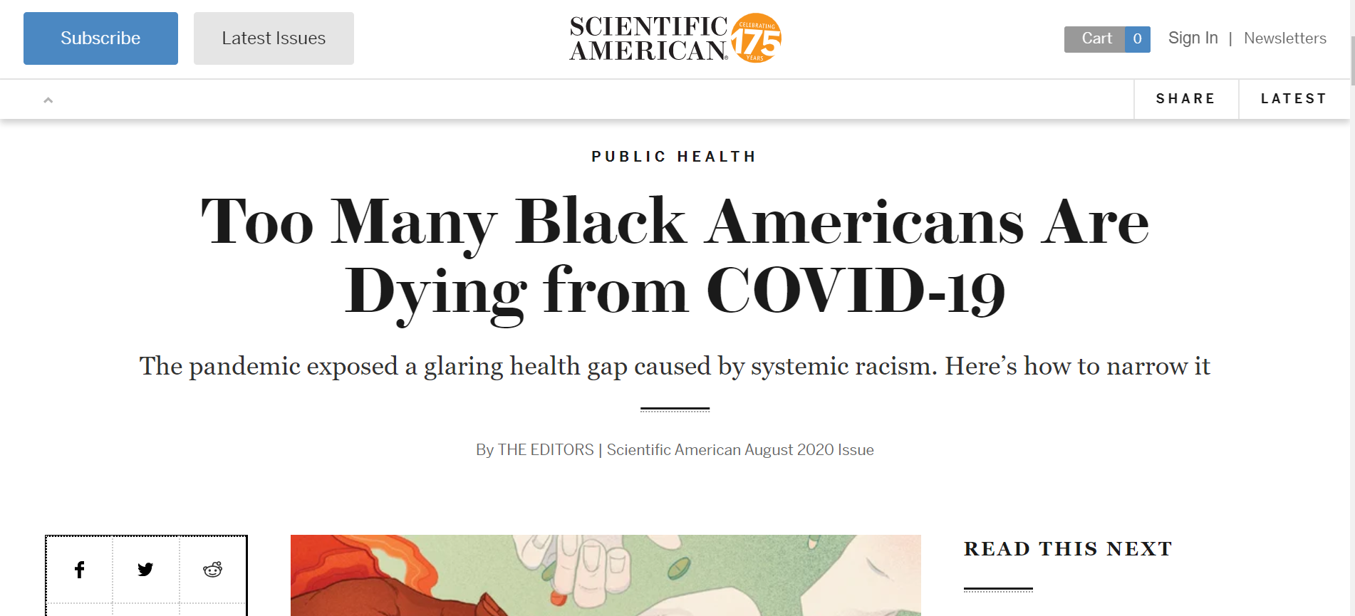From the article: "The U.S. has been roiled this year by two crises that seem on the surface to be unrelated: the coronavirus pandemic and law-enforcement killings of black Americans—the latter leading to mass protests and police violence toward protesters. Although the immediate causes of these two tragedies seem distinct, both have their roots in structural racism. The virus has killed a disproportionate number of black people (as well as other people of color), and black people are by some estimates 2.5 times more likely than white people to be killed by the police. Support is building for police reform, and we can take concrete steps immediately to protect the health of black Americans."