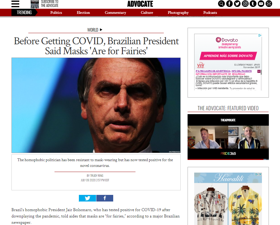 From the article: "Brazil’s homophobic President Jair Bolsonaro, who has tested positive for COVID-19 after downplaying the pandemic, told aides that masks are 'for fairies,' according to a major Brazilian newspaper."