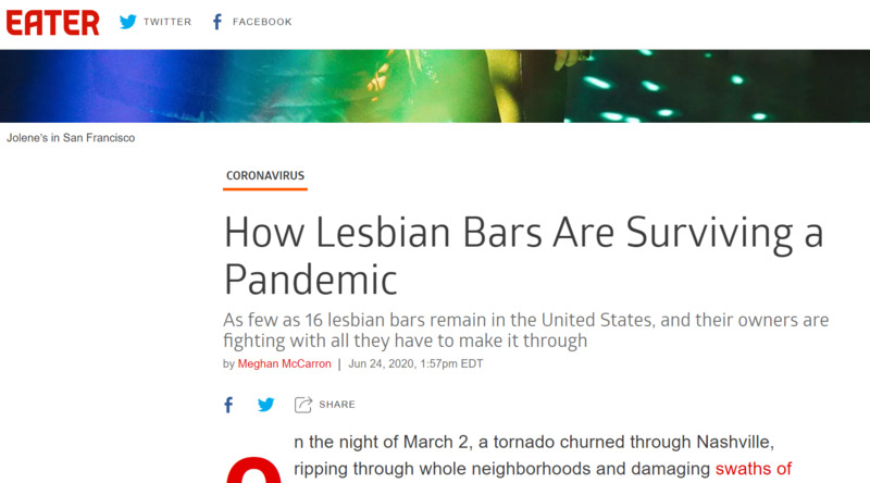 From the article: "As the pandemic stretches onward, America’s few remaining lesbian bars are hanging on for dear life, and waiting for their moment. While there is no official Queer Bar Registry, current estimates put the number of lesbian bars in the United States at a vanishingly small 16. In the 1980s, there were hundreds, according to a study which has confirmed the gut feeling in queer America that the gay bar is in decline, and lesbian bars are the most endangered. Without major community and even government support, COVID-19 could reduce those numbers further — or cause a full-on extinction. Many of the bar owners I spoke to are getting by trading off bills, hoping for landlord understanding, and maxing out their credit cards; some aren’t sure if they can last past June or July if they remain closed. But still, they are holding out hope."