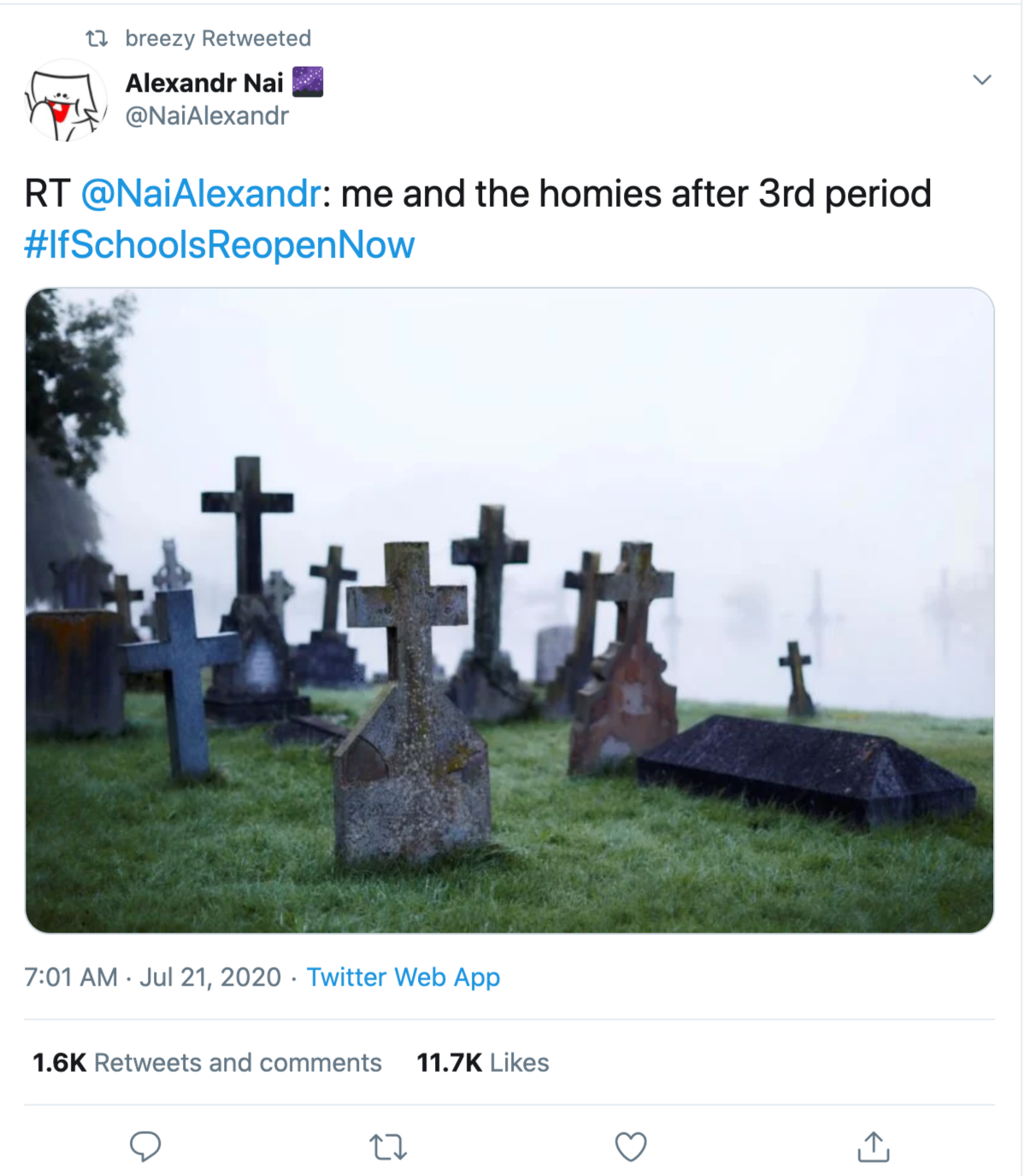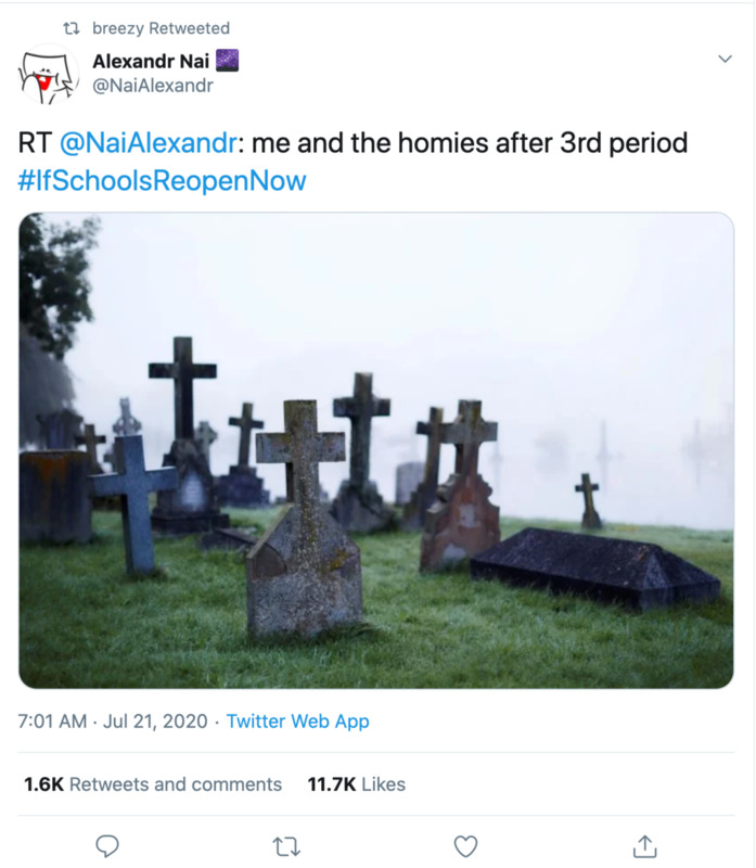 This item was added TAGS v6.1.9.1. I originally searched under the hashtag #ifschoolsreopennow. Within that search, I have chosen to add the following tweet because it highlights the approach that some students/comedians are taking in light of the current debate that is centered around in-person education.