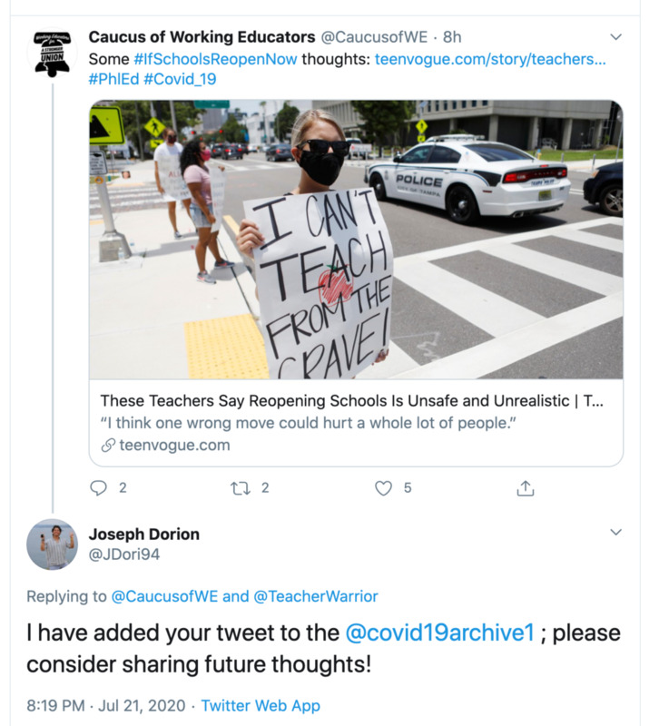 This item was added TAGS v6.1.9.1. I originally searched under the hashtag #ifschoolsreopennow. Within that search, I have chosen to add the following tweet because it is highlighting the divide amongst teachers concerning a desire to return and work with students while also fearing for their safety.