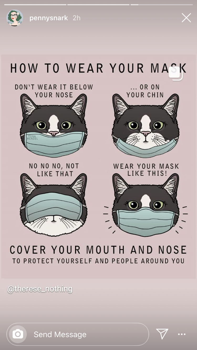 @pennysnark on shared a meme in her instagram story. The meme is a cat wearing a mask in various fashions with explanations on the proper way to wear a face mask.