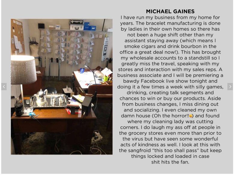I have run my business from my home for years. The bracelet manufacturing is done by ladies in their own homes so there has not been a huge shift other than my assistant staying away (which means I smoke cigars and drink bourbon in the office a great deal now!). This has brought my wholesale accounts to a standstill so I greatly miss the travel, speaking with my stores and interaction with my sales reps. A business associate and I will be premiering a bawdy Facebook live show tonight and doing it a few times a week with silly games, drinking, creating talk segments and chances to win or buy our products. Aside from business changes, I miss dining out and socializing. I even cleaned my own damn house (Oh the horror!! ;P) and found where my cleaning lady was cutting conrners. I do laugh my ass off at people in the grocery stores even more than prior to the virus but have seen some wonderful acts of kindness as well. I look at this with the sangfroid "this too shall pass" but keep things locked and loaded in case shit hits the fan.