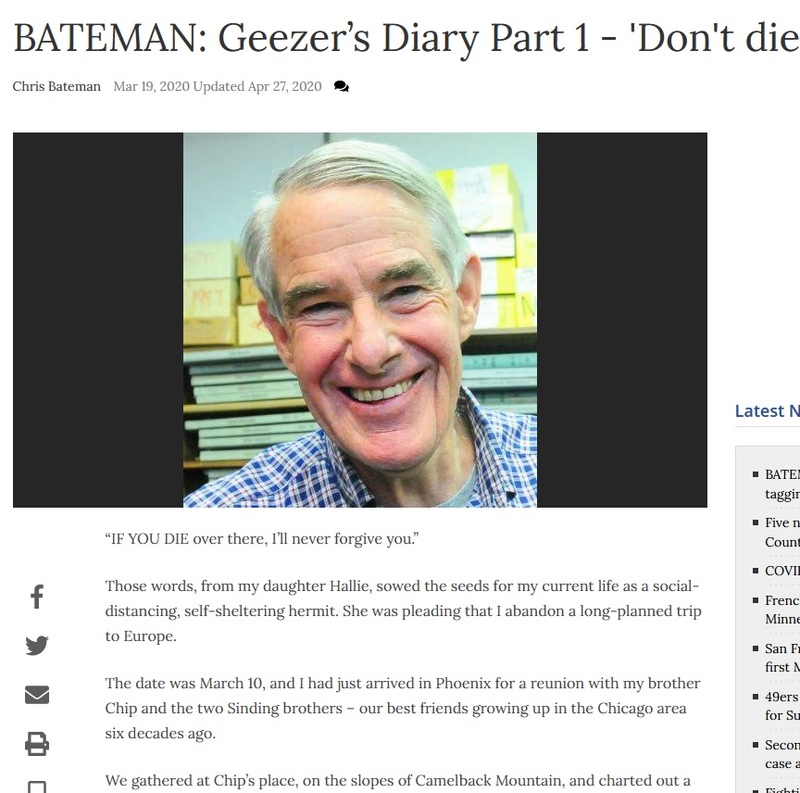 Chris Bateman's first entry for his 'Geezer's Diary' articles for the Union Democrat, the local newspaper for the small town Sonora, California. Chris discusses his children's concerns for his travel plans as COVID-19 really got into full swing in America in March, and how he started social distancing as a result of the pandemic.