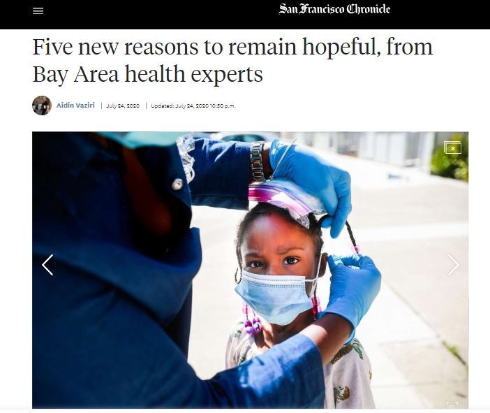 Life has felt very overwhelming lately. While reading the news today, I ran across an article titled "Five new reasons to remain hopeful, from Bay Area health experts." In need of some hope, I gave it a read. The article reminded me that while life remains challenging, there has been progress. The five new reasons to remain hopeful are: 1-we are getting closer to a vaccine, 2-treatments look more promising, 3-testing is getting easier, 4-masks are working, 5-we know more about the virus now. I am choosing to stay safe during this pandemic. And because of that choice comes a lot of personal sacrifice for our family. I hope that I can continue to stay strong and positive as I navigate this new life and world. This article was a good reminder to have faith in progress.
