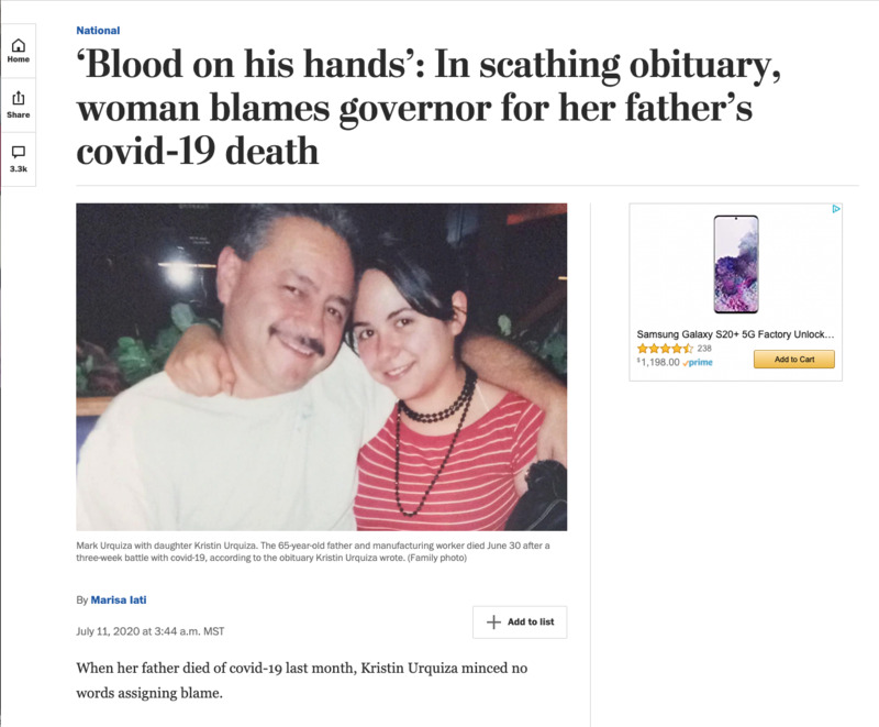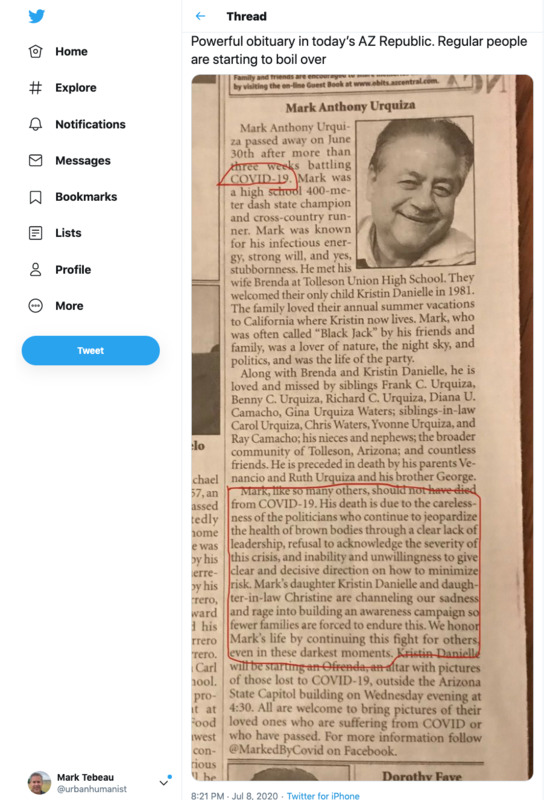 As its contributors, we added this to highlight the very real costs of the pandemic in the working-class and non-white communities that have been hardest hit by the virus. In this instance, Kristin Urquiza wrote an obituary that called out Arizona Governor Doug Ducey for his inconsistent and inadequate response to the crisis. This message highlights the degree to which the virus is not just a biological phenomenon but also a political one.