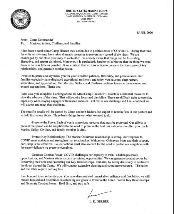 This screenshot of a letter distributed to all Marine Corps and Navy personnel and their families aboard Camp Hansen in Okinawa details the service's priorities in the weeks ahead, as Marine Corps bases across the island do battle against a potentially deadly pathogen. Those priorities include preserving the Force, protecting the Marine Corps-Okinawa relationship, and "generate combat power" to deal with the COVID threat that struck Camp Hansen in July of 2020.