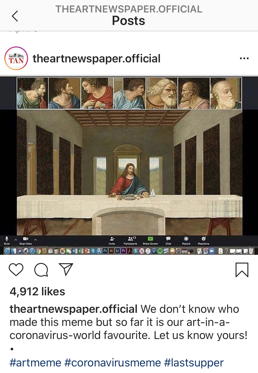 This is a funny and artistic meme depicting Leonardo da Vinci's famous painting, The Last Supper as if it would happen during the pandemic. The supper turned into a virtual event, conducted over Zoom. Jesus is seated at the table with the apostles overhead in their video chat windows.