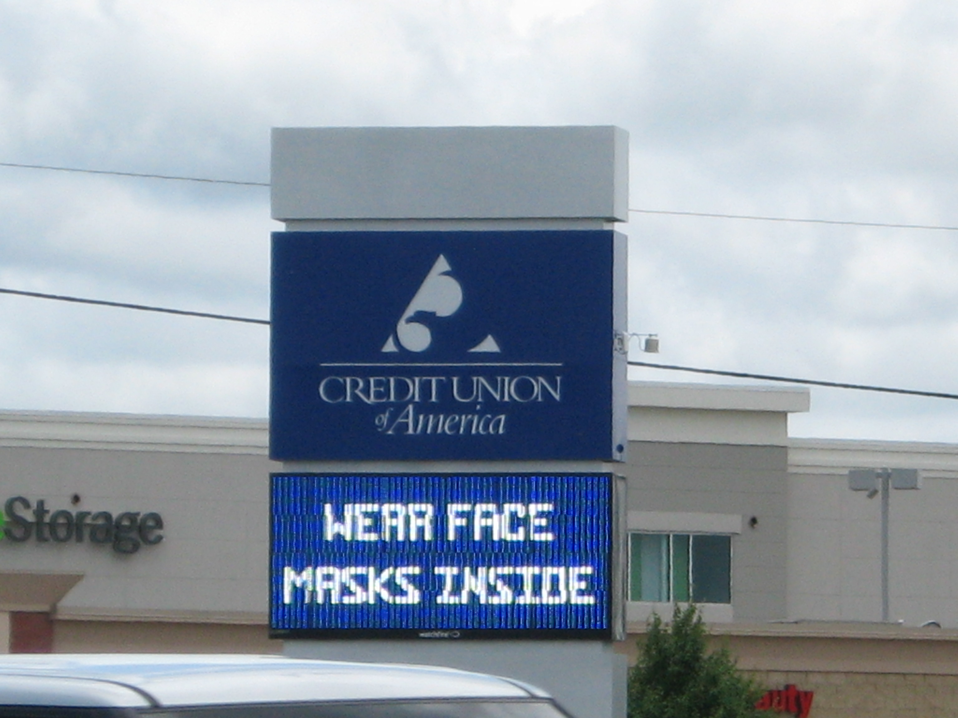 Following Wichita's municipal ordinance overriding the Sedgwick County Commission's decision to forego the governor's mask mandate, citizens were required to wear protective face coverings in all public spaces within the city limits. Electronic billboards and marquees, such as this one from west Wichita's Credit Union of America, announced that all customers must comply with this order should they wish to conduct business within their environs, while at the same time offering contactless methods for various bank transactions. These photographs underscore the urgency of both masks and social distancing, two of the most effective anti-COVID countermeasures, in combating a rapidly accelerating outbreak that city and Kansas state officials struggled to corral during the summer of 2020.