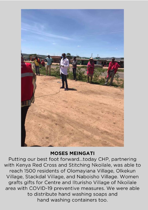 Putting our best foot forward... today CHP, partnering with Kenya Red Cross and Stitching Nkoilale, was able to reach 1500 residents of Olomayiana Village, Olkekun Village, Stackdal Village, and Naboisho Village. Women grafts gifts for Centre and Ilturisho Village of Nkoilale area with COVID-19 preventative measures. We were able to distribute hand washing soaps and hand washing containers too.