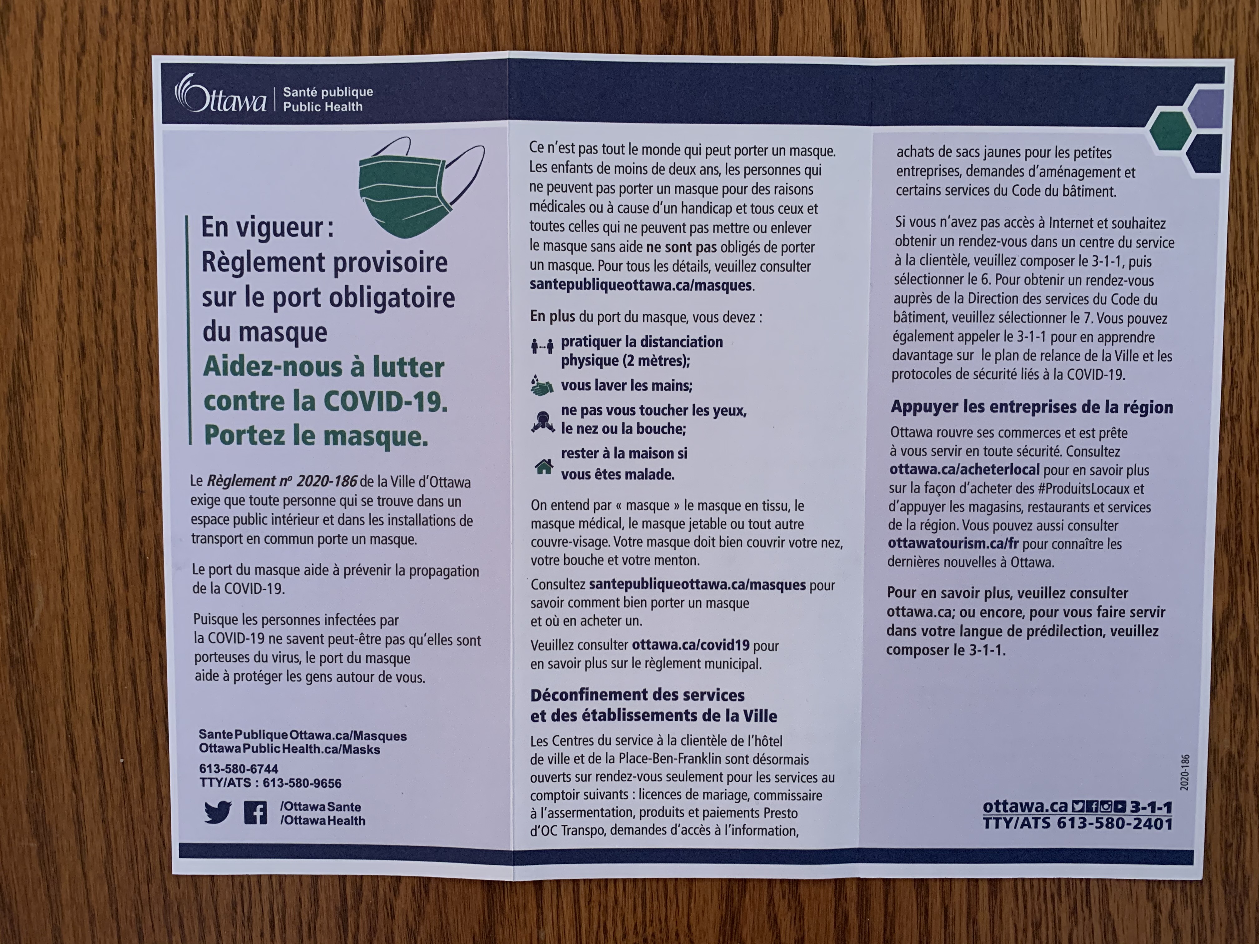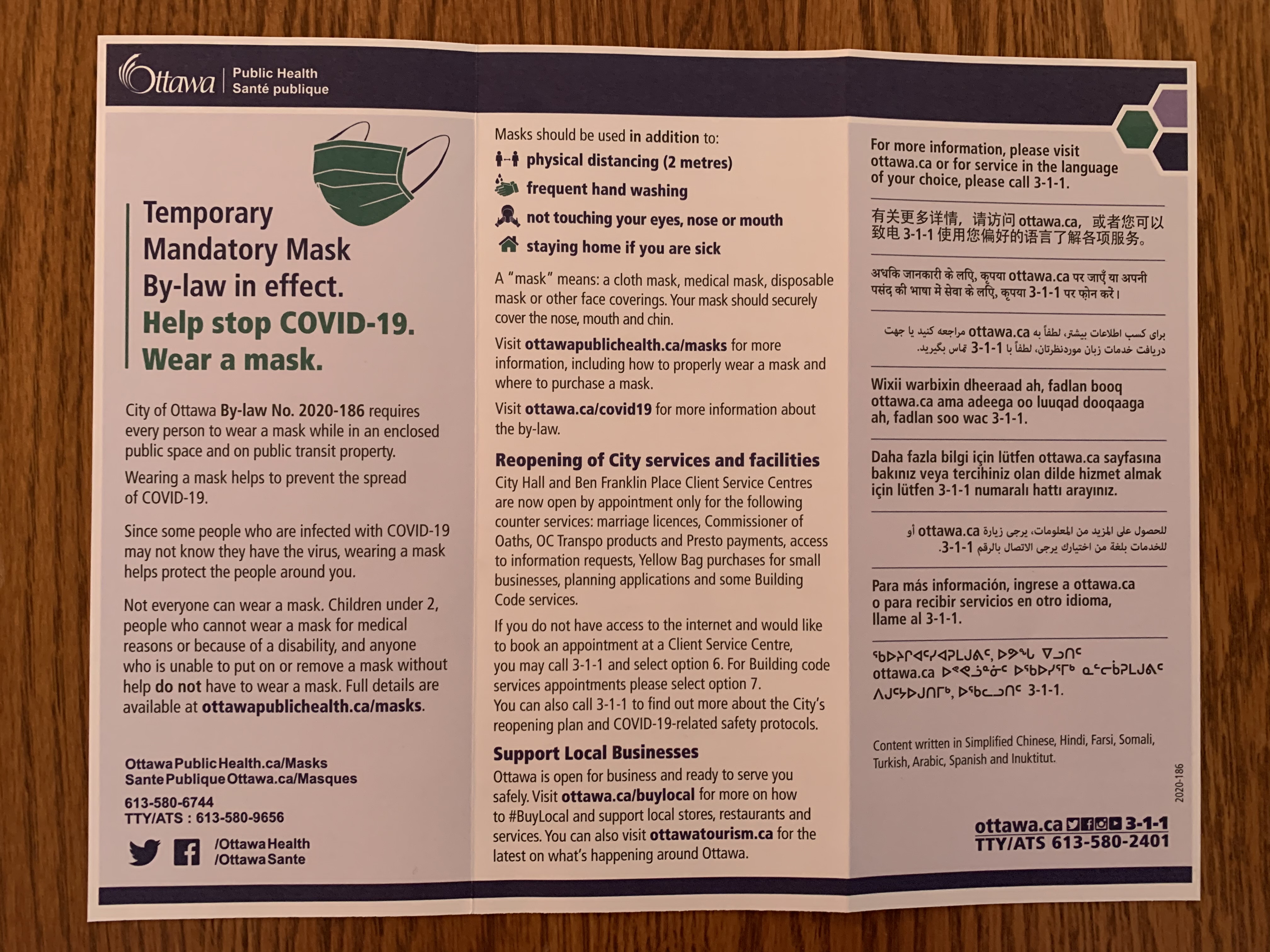 A pamphlet given to all residences in Ottawa through the mail explaining that there is now a "Temporary Mandatory Mask By-Law in effect." It then goes on to explain other public health measures to be observed and the reopening of city services. There is also a panel which reads "For more information, please visit ottawa.ca or for service in any language of your choice, please call 3-1-1." translated into Simplified Chinese, Hindi, Farsi, Somali, Turkish, Arabic, Spanish, and Inuktitut. The reverse is the same in French.