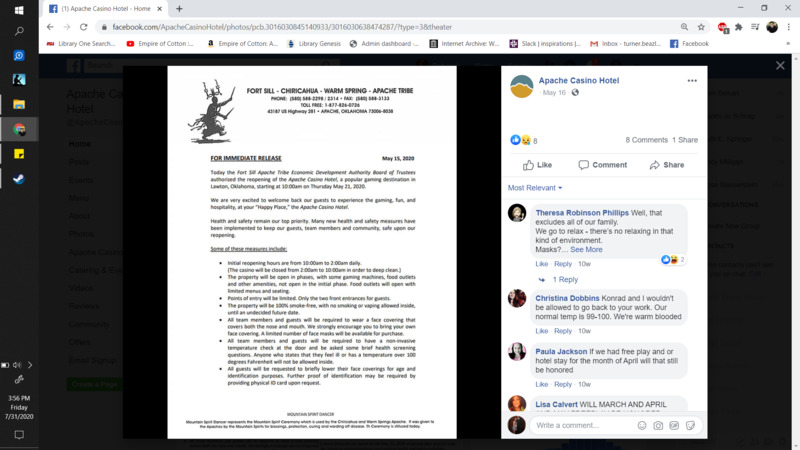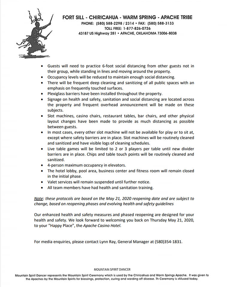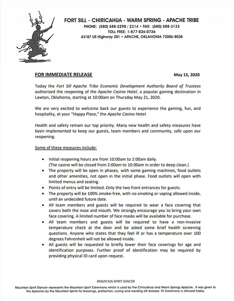 "Today the Fort Still Apache Tribe Economic Development Authority Board of Trustees authorized the reopening of the Apache Casino Hotel, a popular gaming destination in Lawton, Oklahoma, starting at 10:00am on Thursday May 21, 2020."