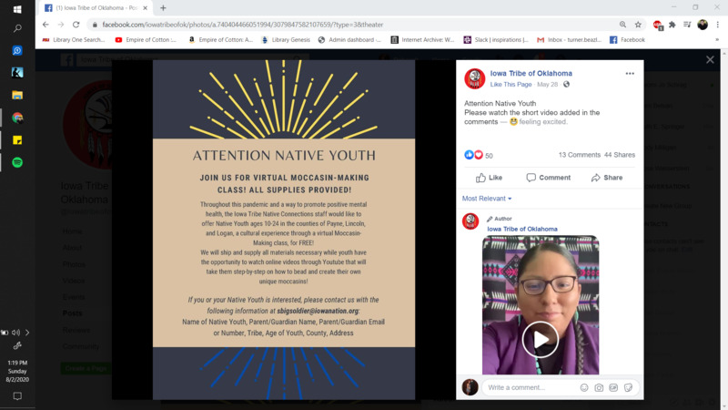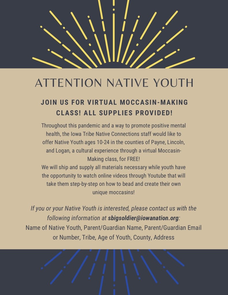 "Throughout this pandemic and a way to promote positive mental health, the Iowa Tribe Native Connections staff would like to offer Native Youth ages 10-24 in the counties of Payne, Lincoln, and Logan, a cultural experience through a virtual Moccasin-Making class, for FREE!"
