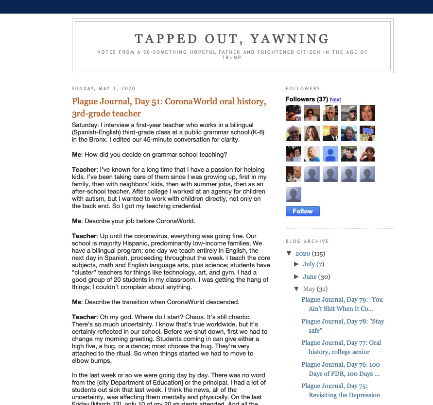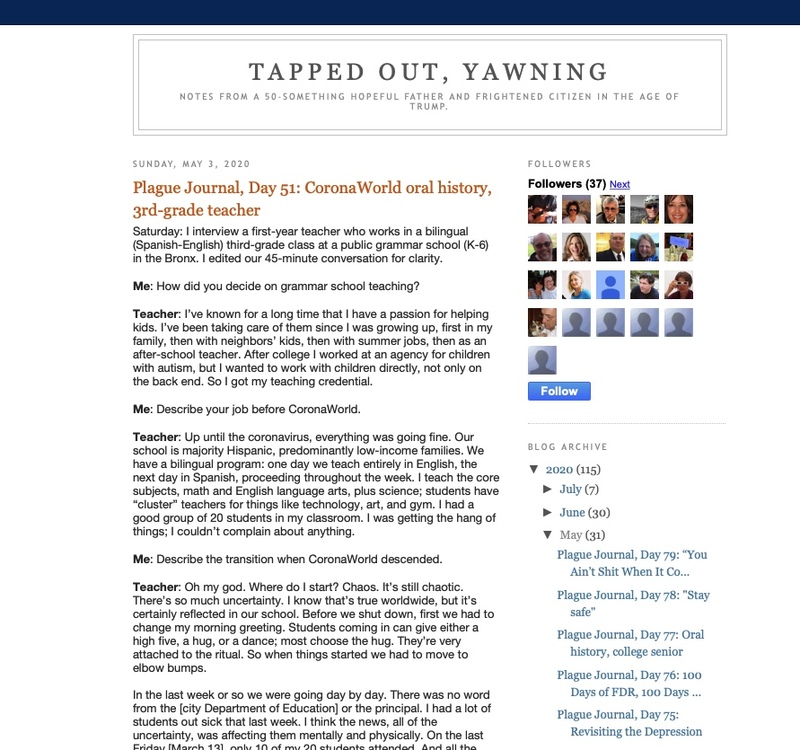 Plague Journal, Day 51: CoronaWorld oral history, 3rd-grade teacher
