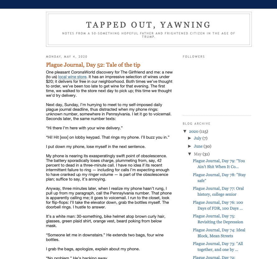I'm keeping a Covid-19 journal. In the latest entry, I forget to tip a delivery man, try to rectify my error, fail. Or not: