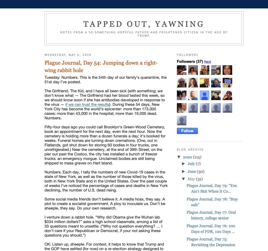 I'm keeping a Covid-19 journal. In the latest entry, as the bodies pile up I explore a Trumpian disinformation rabbit hole involving a Wuhan lab, a New York-based research group, and an NIH grant. Also, a potential job goes up in smoke.