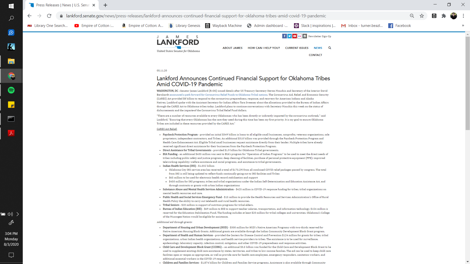 "Senator James Lankford (R-OK) issued details after US Treasury Secretary Steven Mnuchin and Secretary of the Interior David Bernhardt announced a path forward for Coronavirus Relief Funds to Oklahoma Tribal nations. The Coronavirus Aid, Relief, and Economic Security (CARES) Act provided $8 billion to respond to the coronavirus preparedness, response, and recovery for American Indians and Alaska Natives. Lankford spoke with the Assistant Secretary for Indian Affairs Tara Sweeney about the allocations provided to the Bureau of Indian Affairs through the CARES Act to Oklahoma tribes today. Lankford plans to continue conversations with Secretary Mnuchin this week on the status of disbursements and the impacts of the Coronavirus Tribal Relief Fund dollars."