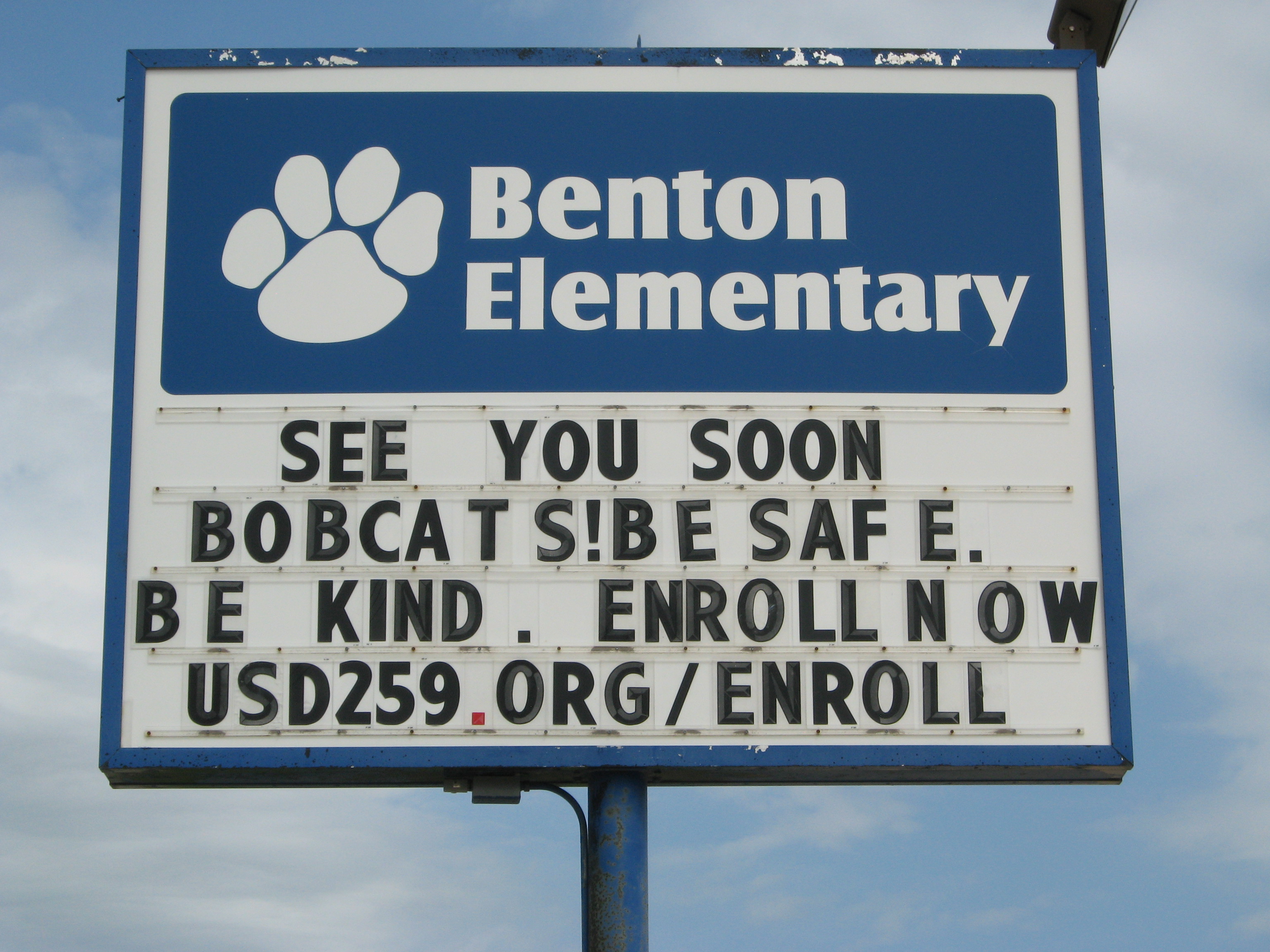 The marquee along Maple Street, Wichita, Kansas, for Benton Elementary School urges parents to enroll their children now in what many thought would be a challenging school year. In late July, the Wichita school board delayed the start of the school year until after Labor Day in order to give faculty and staff more time to adjust their curriculum to more flexible models, clean facilities, and set up necessary shields, barriers, and social distancing measures. Despite the mandate requiring these measures, as well as masks and hand washing every hour, teachers and students still ventured into an uncertain school year, as Wichita-area schools forged ahead with in-person instruction and contact sports.
