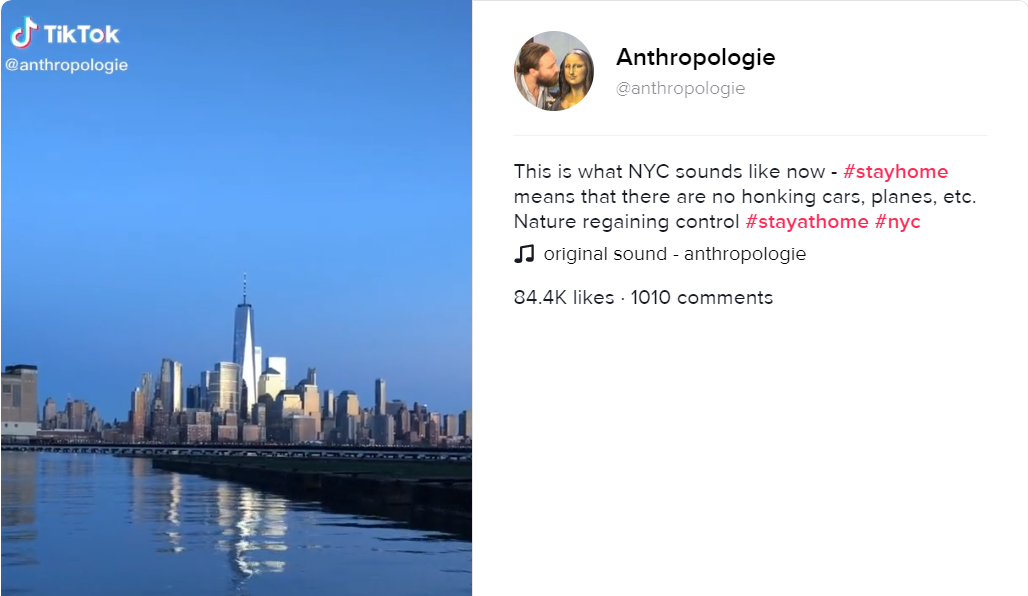 Birds and other sounds of nature are now audible because of the extreme decreases in human activity in New York City due to COVID-19. This media goes to show how much of an effect humans have on nature.Original caption by the creator: This is what NYC sounds like now - #stayhome means that there are no honking cars, planes, etc.
