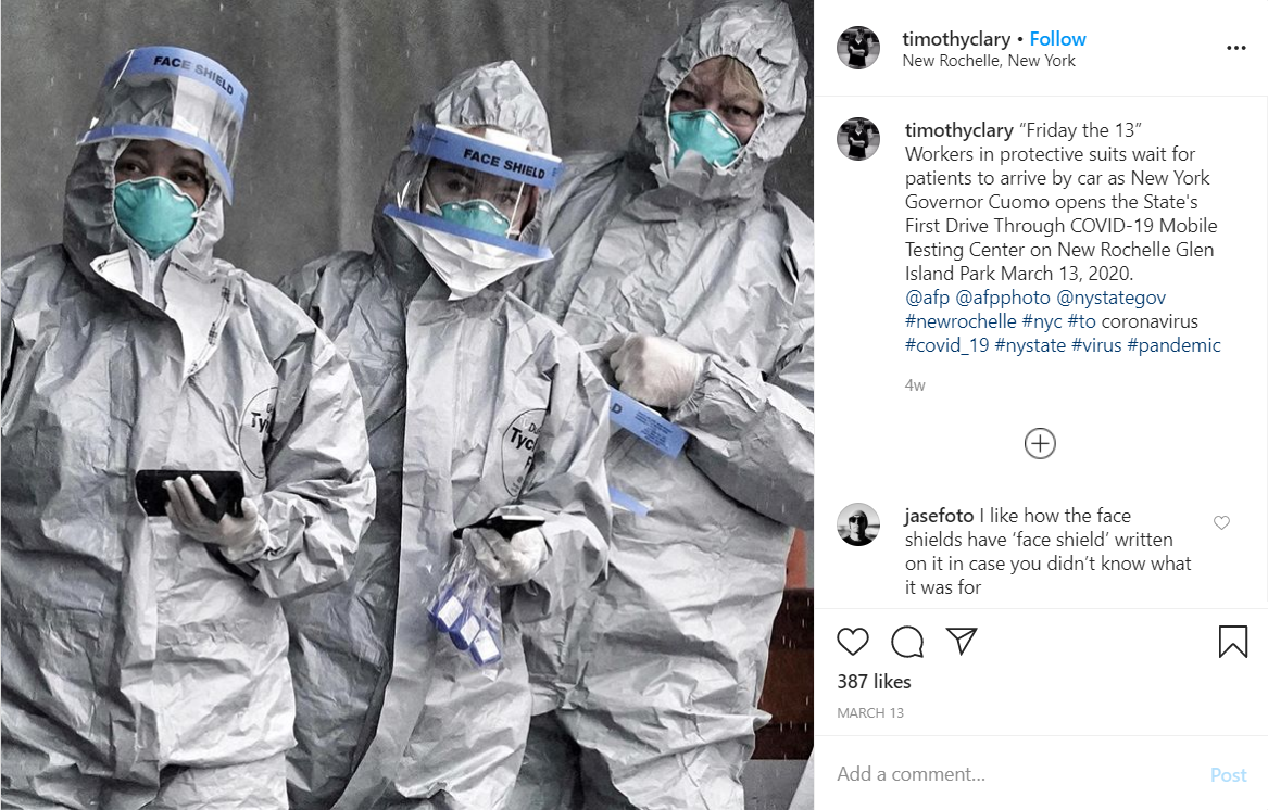 Photograph of healthcare workers in protective bodysuits.This photograph is extremely powerful. Healthcare workers are risking their lives every day to save people, working hours on end and we should be thankful for their work every single day.