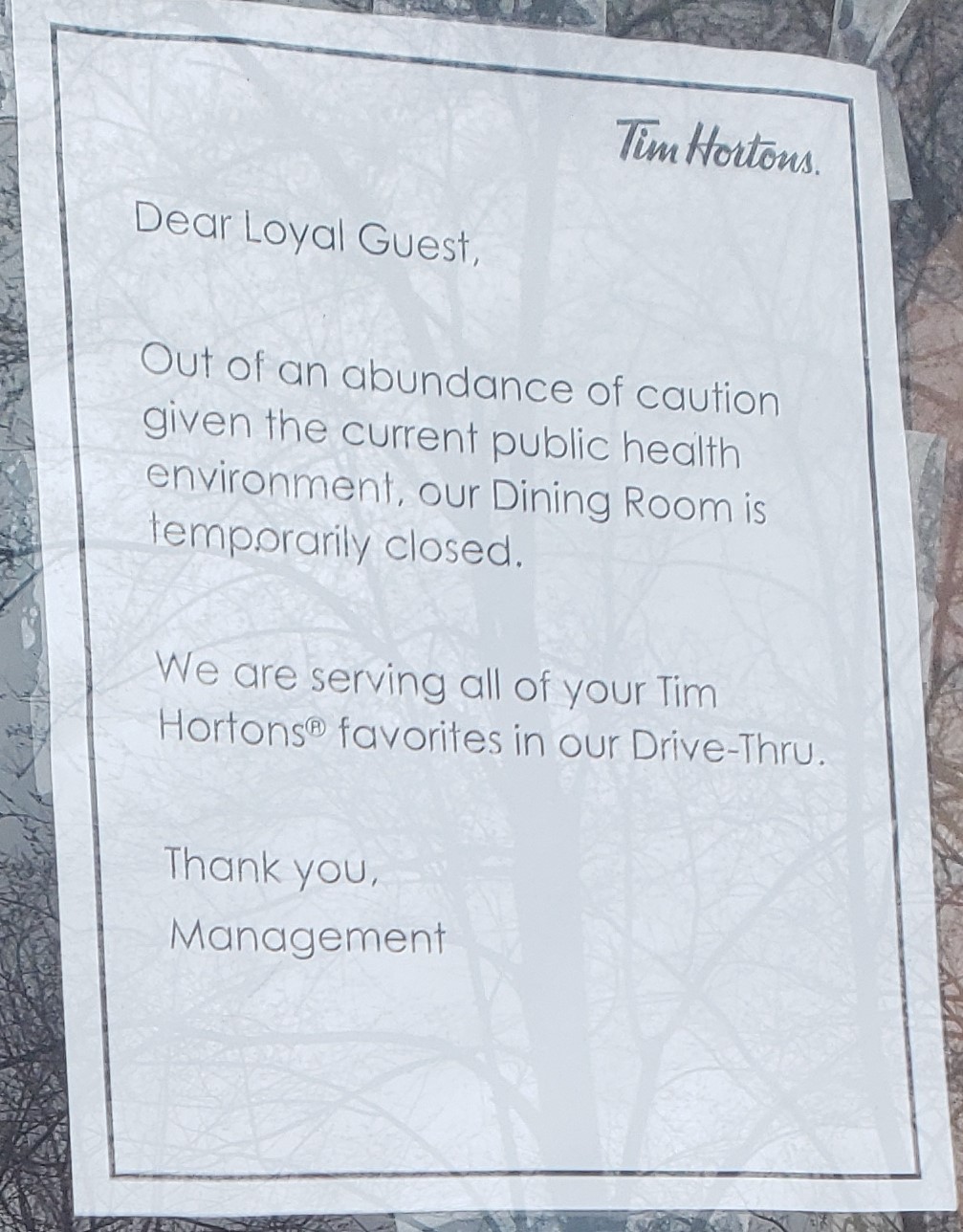 This sign was posted on the Drive-Thru window at Tim Horton’s to inform customers that the store is now operating solely through the Drive-Thru. Hopefully, loyal customers will continue to return even if it alters their routine. “Dear Loyal Guests,Out of an abundance of caution given the current public health environment, our Dining Room is temporarily closed. We are serving all of your Tim Horton’s favorites in our Drive Thru.Thank You, Management