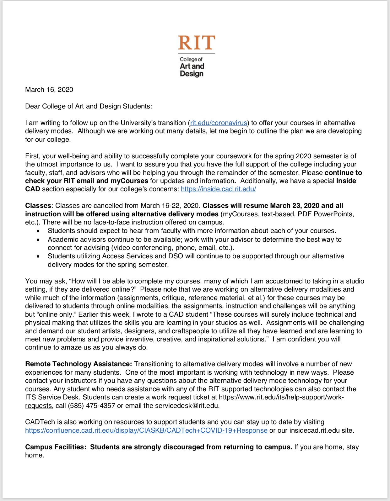 A letter from the dean of the Rochester Institute of Technology College of Art & Design to students following the university’s decision to close the campus in response to the COVID-19 pandemic.
