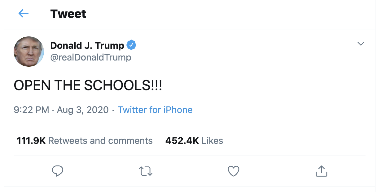 As a teacher I have witnessed quite a large debate playing out at school board meetings, over social media, and across the dinner table about whether or not schools should reopen for the fall semester. Perhaps one of the most compelling arguments I have seen is this recent tweet from President Trump. This description is very much full of sarcasm. Please, for the love of all humanity, consider the common good. Teachers want to go back to school but we want to do it safely. For right now, we need to be ok with teaching online. It's not ideal but we can make it work.