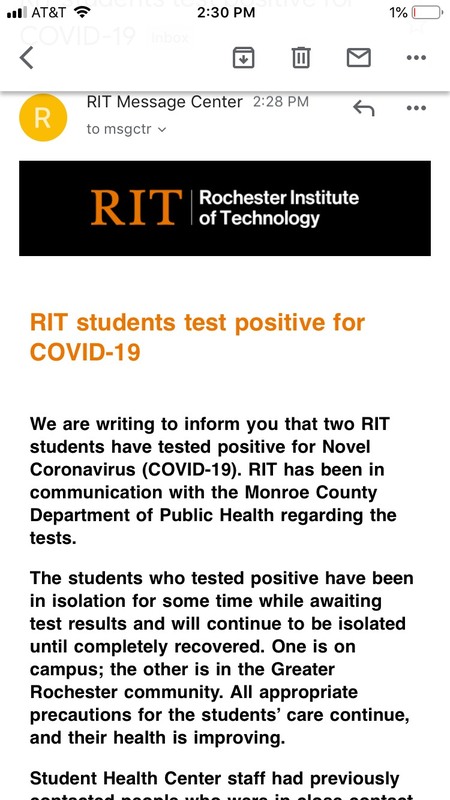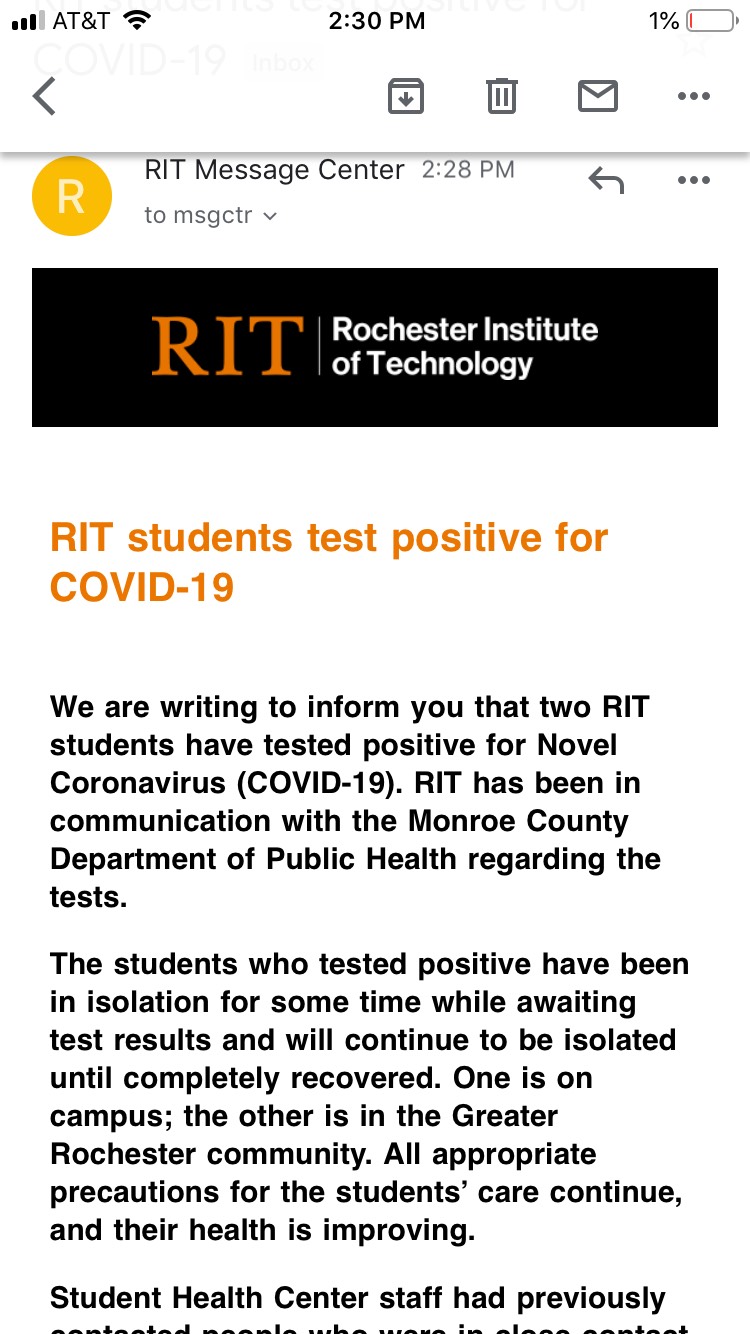 RIT students test positive for COVID-19 Email sent to Faculty and Students at RIT