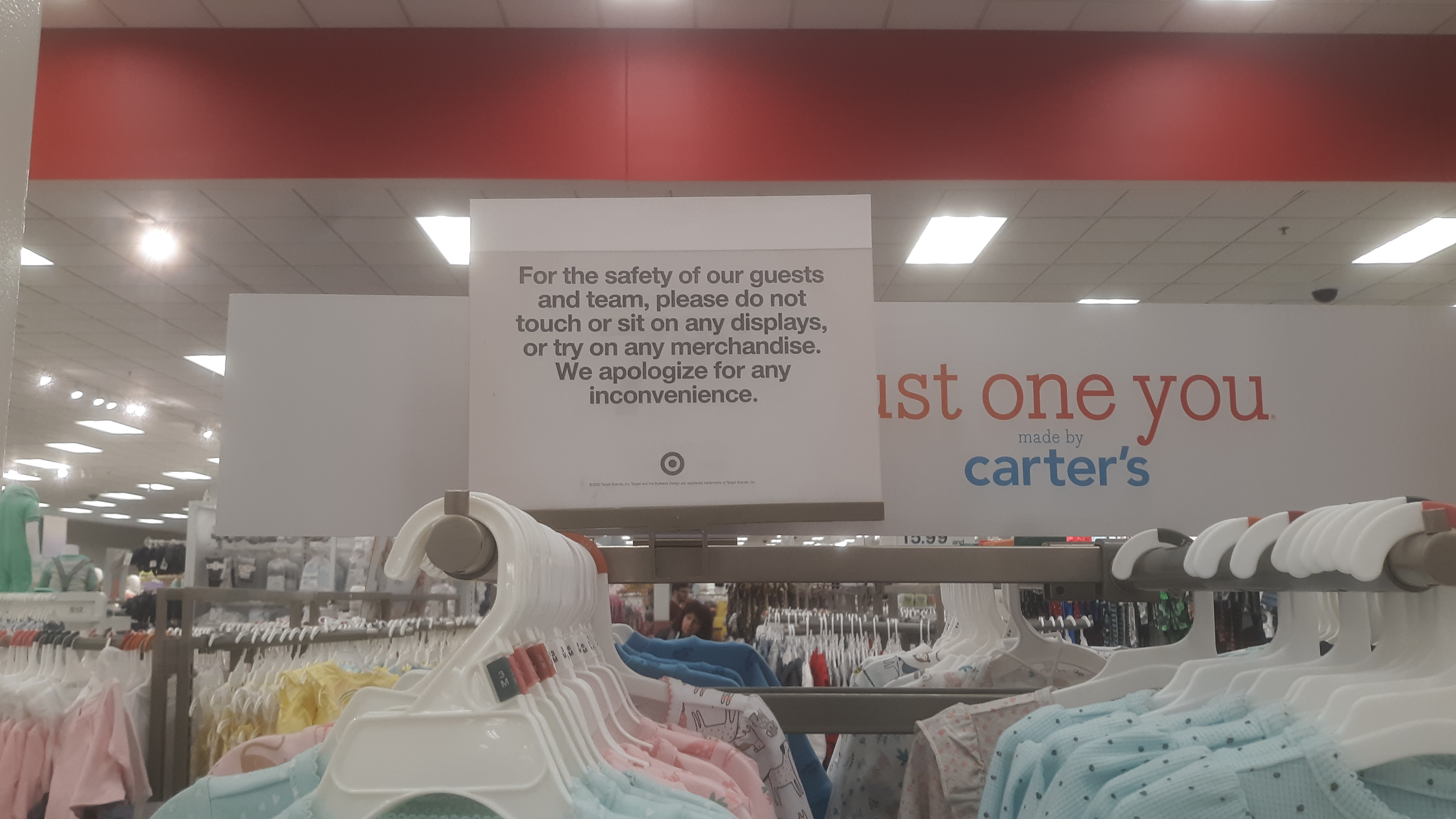 This sign in the infant and toddler clothing section depicts the temporary policy at a Target in North Wales, Pennsylvania that asks customers to not try on clothing and not touch displays.
