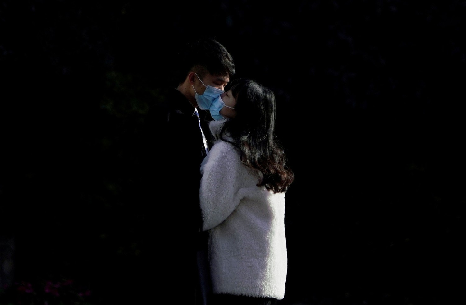 This is an image of a young couple kissing with face masks in Shanghai, China. This shows the social changes that are being made during this time.