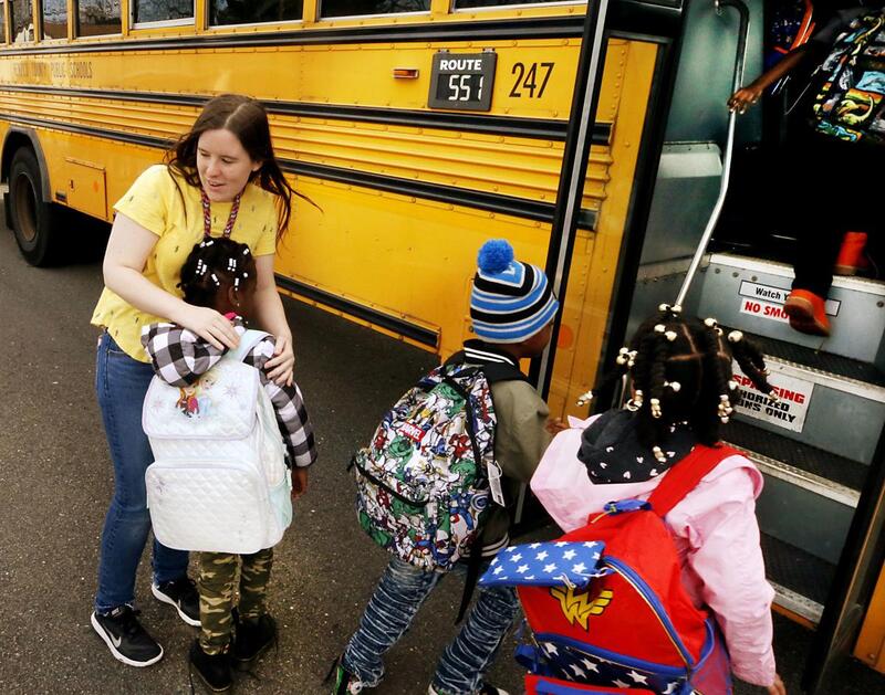 Sara Black, a teacher at Glen Lea Elementary School is shown hugging students before they board a school bus. Due to school closures for at least 14 days, it is assumed that she is saying goodbye as they are unsure when they will see each other in person again.