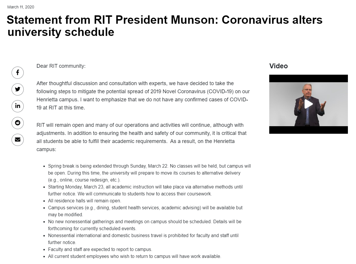 I was on Spring Break when RIT announced they were extending Spring Break a week and all in-person classes were cancelled. This has impacted my senior semester of school drastically.