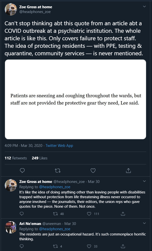 Throughout the COVID-19 pandemic, people in nursing homes, psychiatric institutions, prisons, and other group settings are trapped without the ability to protect themselves by practicing social distancing from others, and their health is at risk from those bringing the virus in from outside. Zoe Gross, Director of Operations at the Autistic Self Advocacy Network, criticizes a Spokesman-Review article written by Martha Bellisle. The article highlights the infection risk to workers at a psychiatric institution, but does not discuss the safety of patients as a priority, portraying them not as people in need of protection, but as ‘occupational hazards’ to the people whose safety matters more.