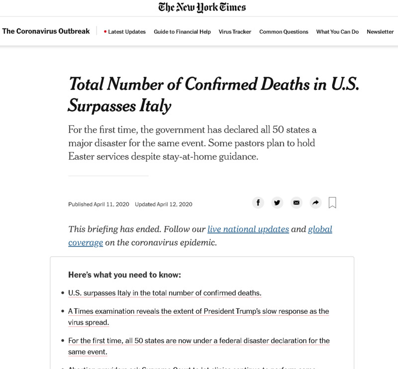 This is a news article stating how Coronavirus deaths in the US have reached 20,229, greater than Italy’s death toll which stood at around 19,000. Almost half of the deaths in the US are from New York at around 9,385. As someone who lives down in Long Island, which is where most of these deaths are located, it’s very concerning.
