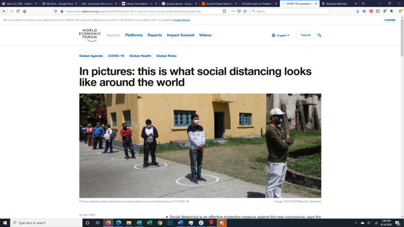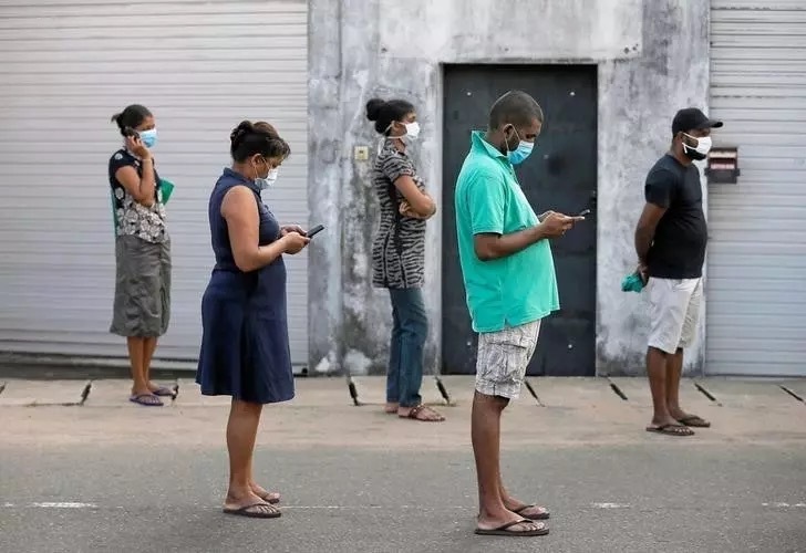 This image shows the measures that individuals are taking in order to avoid transmission of COVID-19. These individuals are seen standing at least a meter apart during a break in the government issued COVID-19 curfew while waiting in line for supplies, food, etc.