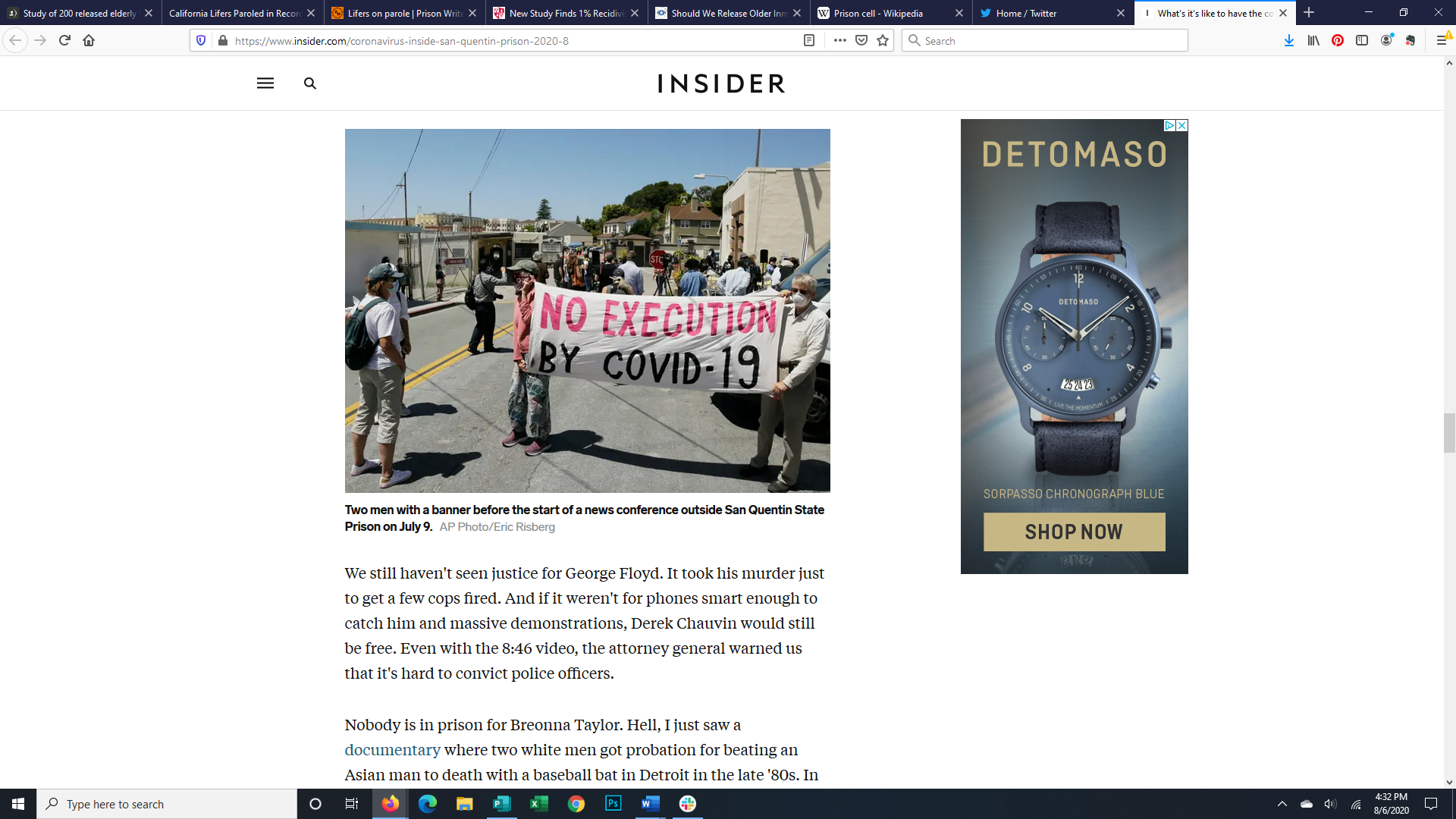 This article, written by a currently incarcerated man at San Quentin Prison in California, explains what it is like to be incarcerated during the Covid Pandemic and their lack of information. He asks if it is justice to leave people in prison during the pandemic, explains the stress and helplessness so many feel, talks about the racism that landed many of them in prison, and the very low recidivism rate of lifers.