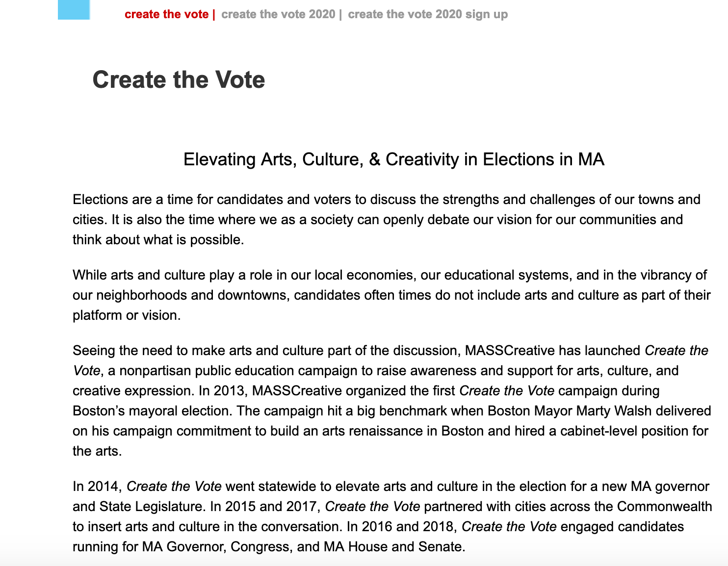 An initiative that started in 2014, Create the Vote is a nonpartisan public education campaign that encourages voters and lawmakers to support art and culture. The Create the Vote Campaign 2020 serves to encourage citizens to support arts and culture with their vote to encourage creativity in Massachusetts