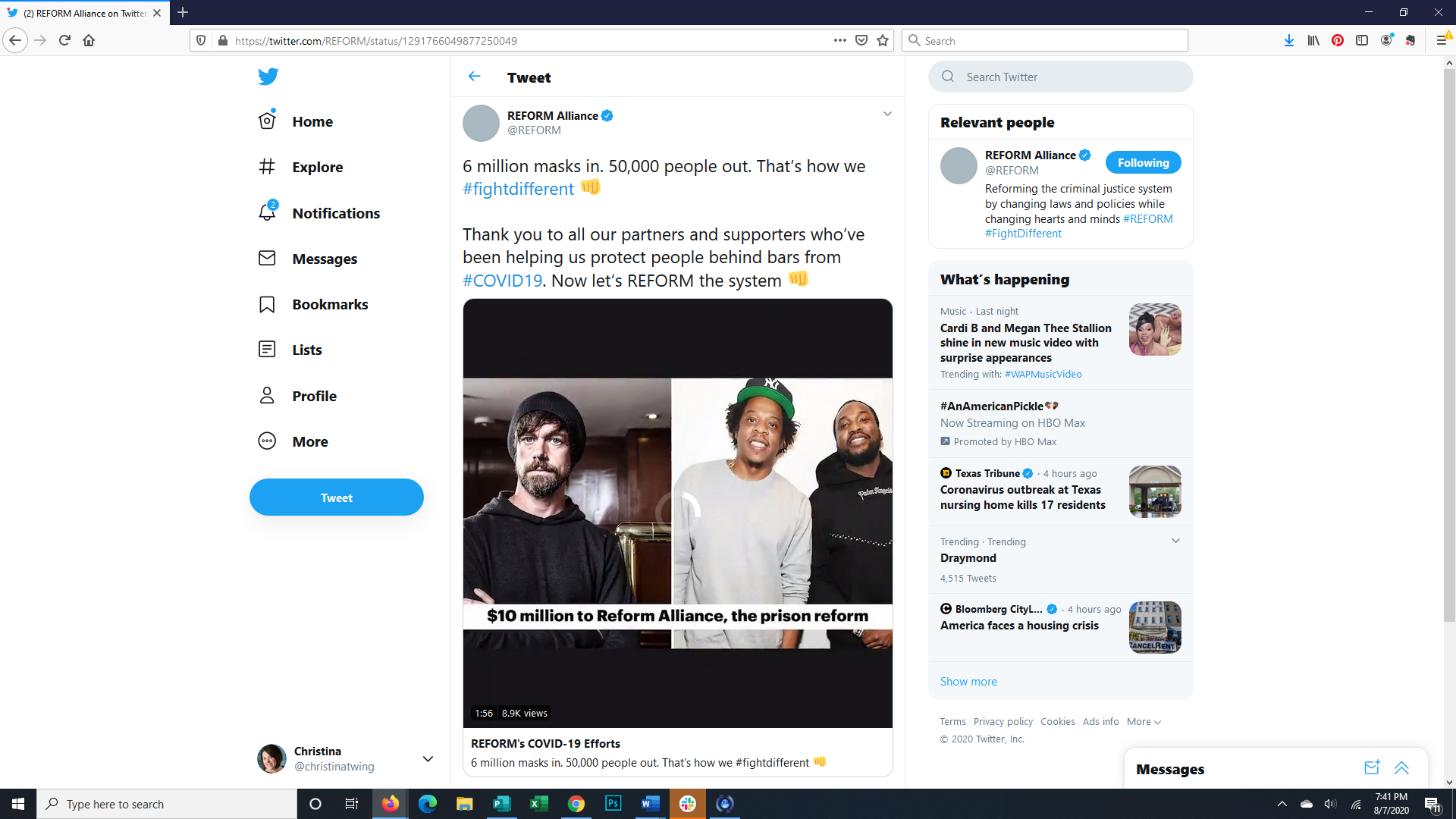This Tweet from REFORM Alliance explains they have gotten six million masks into correctional facilities across the nation by using the 10 million dollar donation from Twitter's CEO, Jack Dorsey. And 50,000 people have been released. The accompanying video explains that if the nations 2.4 million incarcerated people become ill and go to outside hospitals there will be no hospital space for anyone else. If that isn't enough to make you care they pose the question, do any incarcerated people deserve a defacto death sentence?