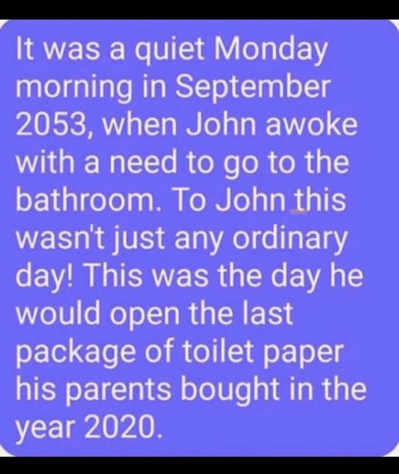 This one will appeal to all historians. It is written like an opening paragraph in a serious literary work which makes it funnier. The joke is about all the hoarding of the toilet paper that went on when Coronavirus first hit. Finally, 33 years later, the last of the toilet paper stash is about to be used up.