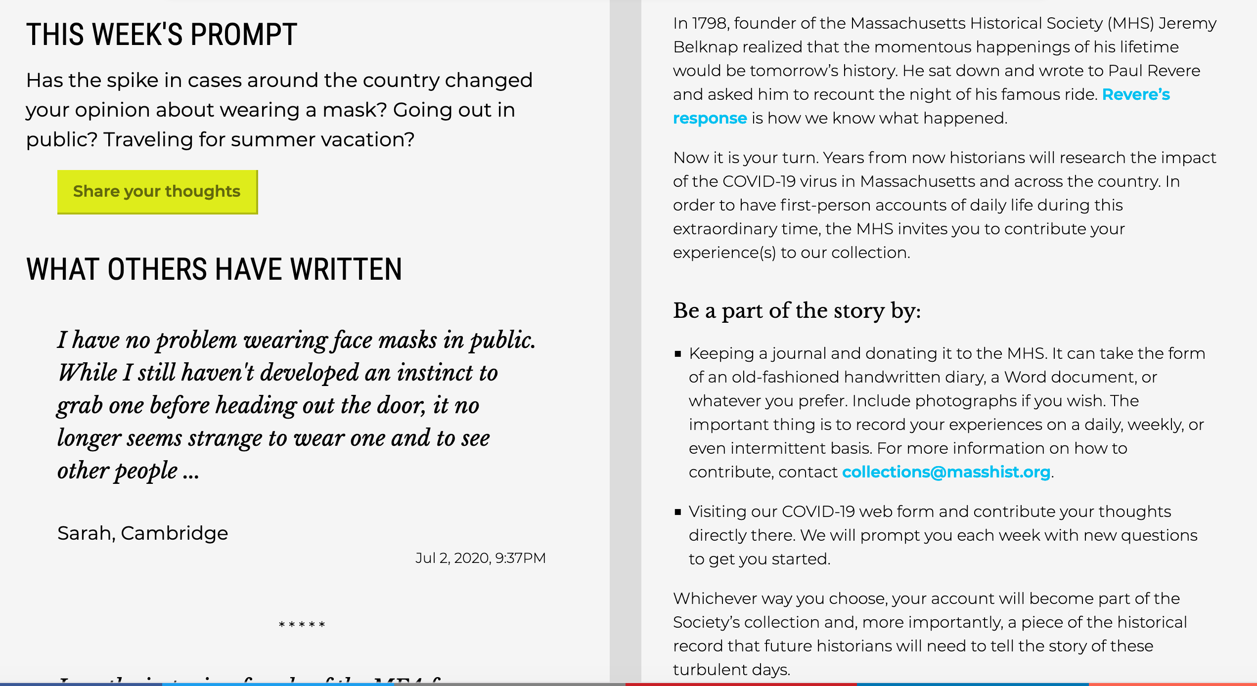 This webpage invites audiences to include their perspectives of the Covid-19 pandemic. Individuals can write a few sentences about their experiences and help build a database of responses. Functioning as a digital journal, the Massachusetts Historical Society collects how Boston residents respond to certain prompts pertaining to the Covid-19 pandemic.
