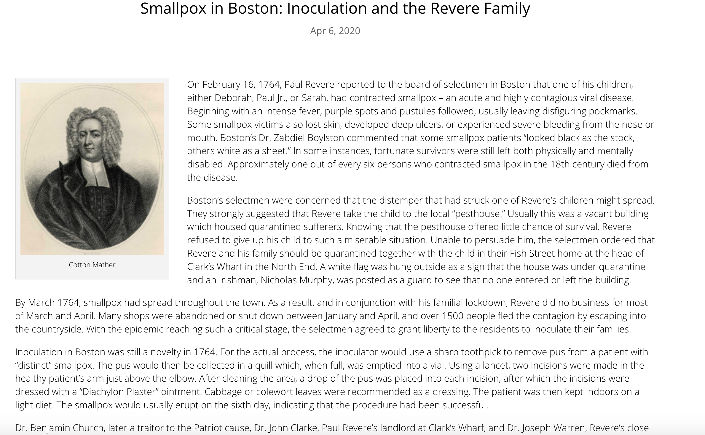 As the Covid-19 pandemic began to spread in Boston, museum interpreters at the Paul Revere house looked to the archives to learn more about how Boston has responded to wide-spread illness in the past. This blog post from The Revere Express blog explains how the smallpox epidemic effected the Revere Family and ways that 18th century medicine responded to the illness.