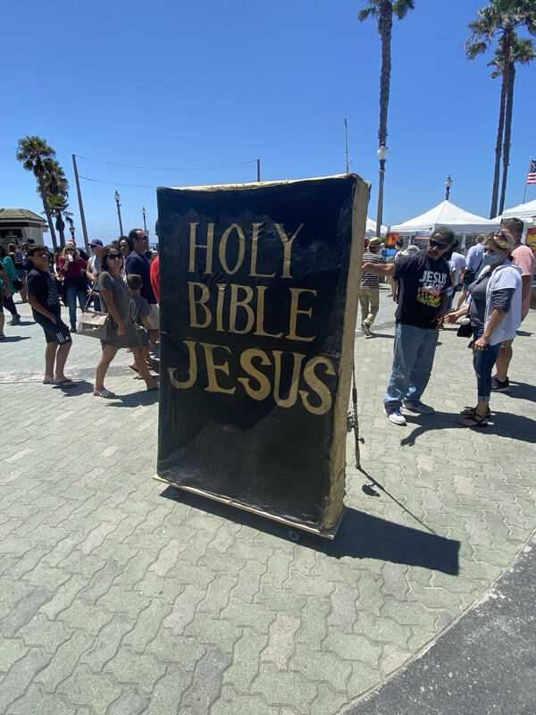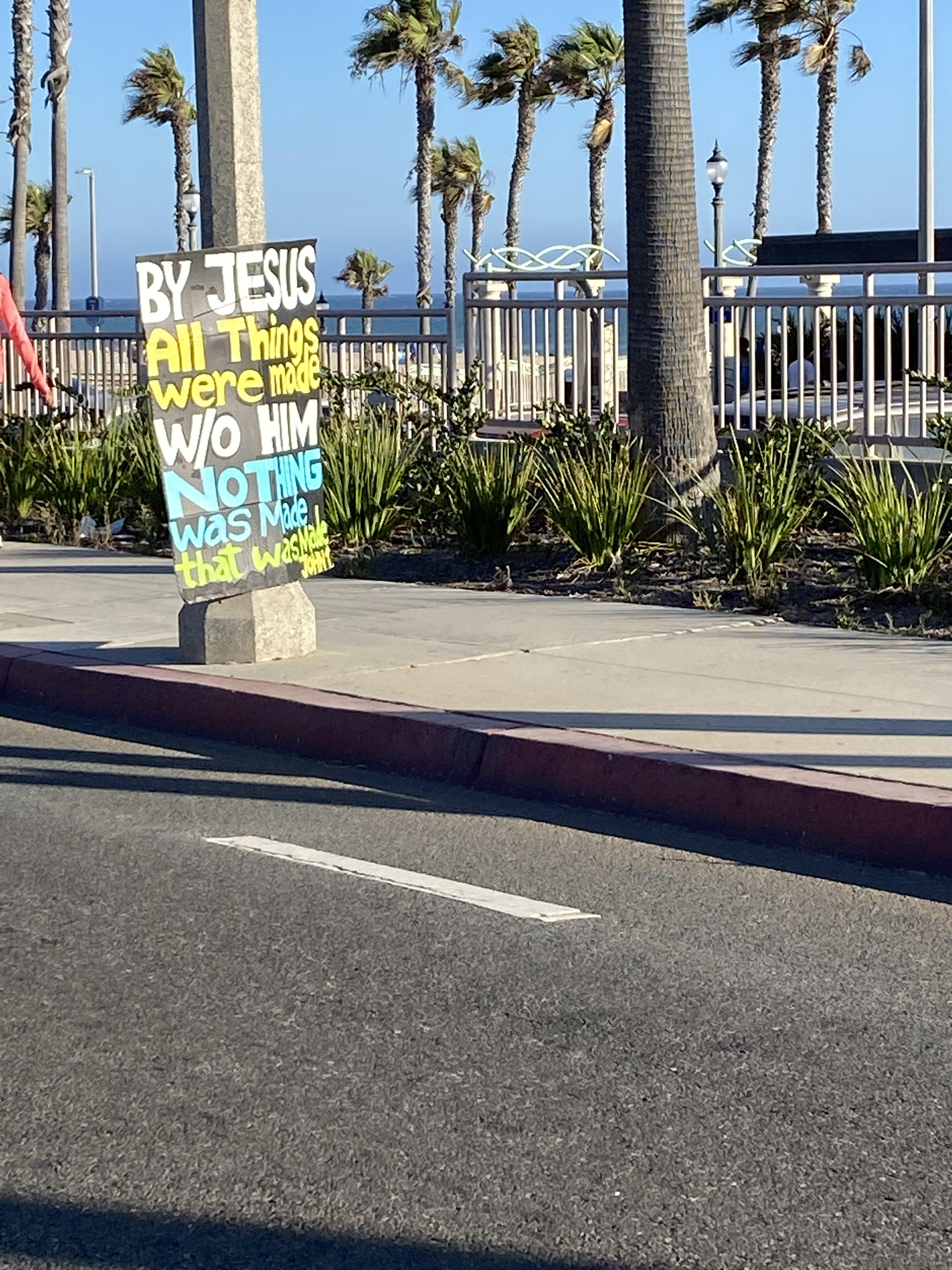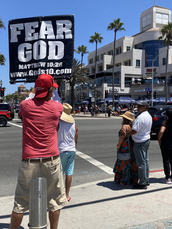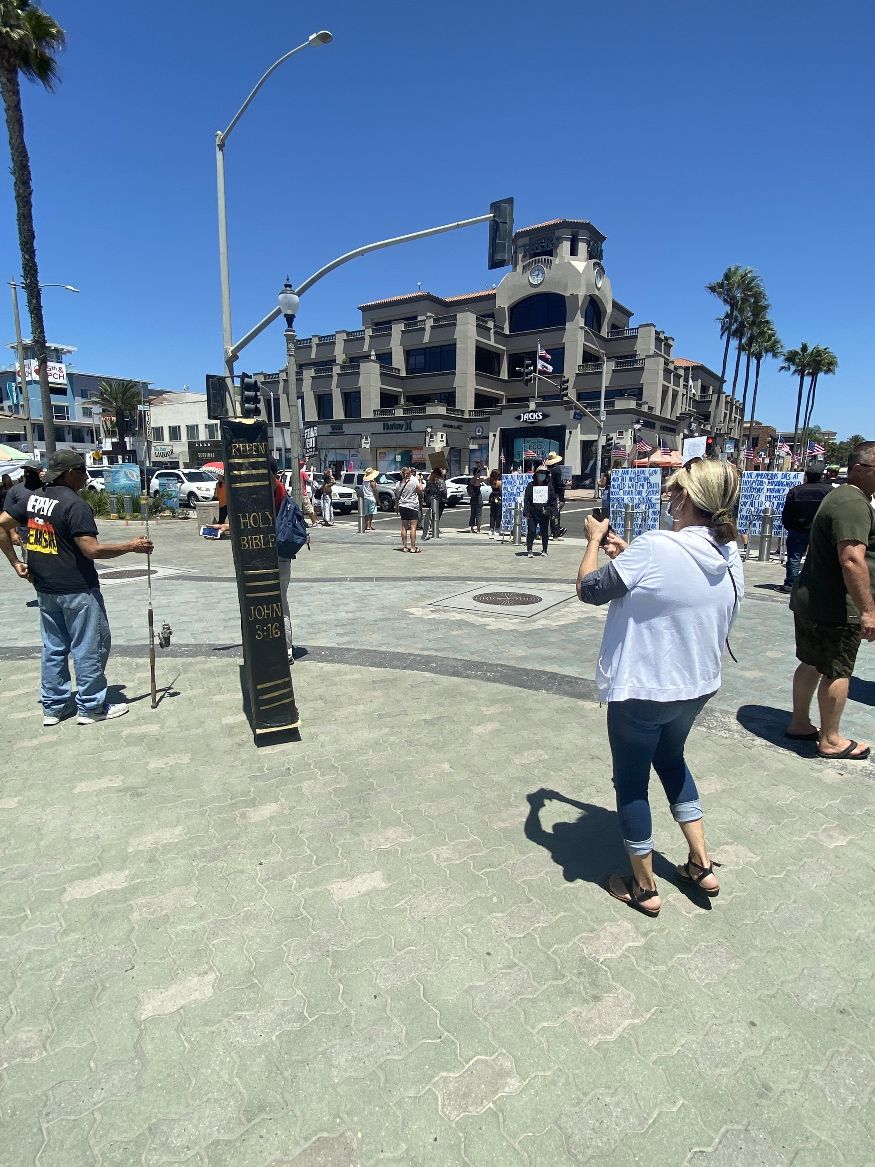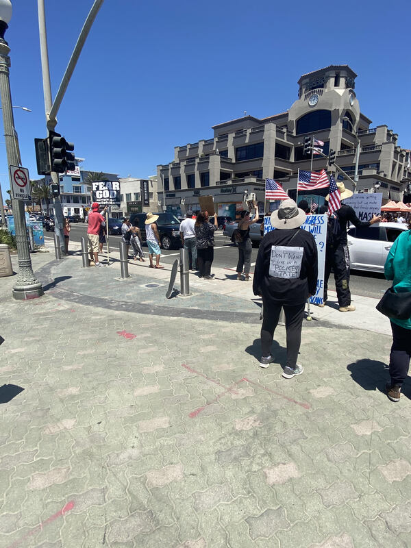 I work in downtown Huntington Beach. Protests around these three topics has been quite regular. With a vast mixture of people wearing and not wearing facial coverings as mandated by the state. On this particular day there was a "black lives matter" protest, which was accompanied and/or countered by Christian evangelists as well as a single individual protesting for the re-opening of California businesses.